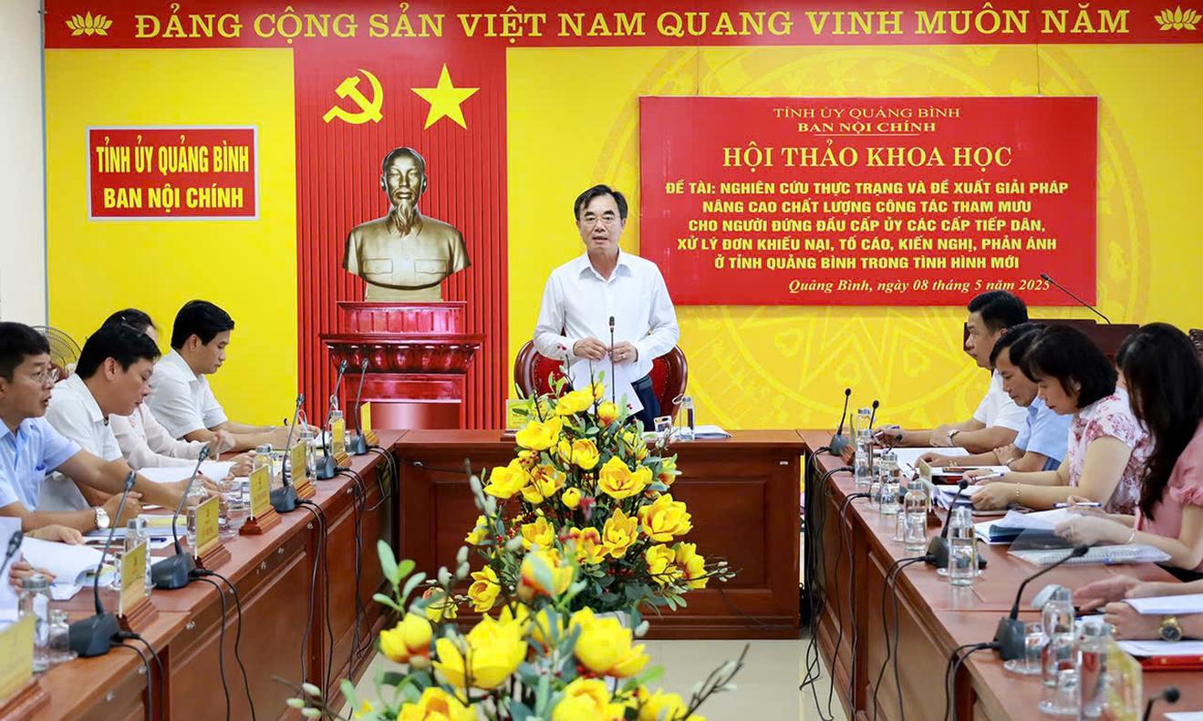 (Thanh tra) - Sáng 8/5, Ban Nội chính Tỉnh ủy tổ chức hội thảo khoa học đề tài cấp tỉnh “Nghiên cứu thực trạng và đề xuất giải pháp nâng cao chất lượng công tác tham mưu cho người đứng đầu cấp ủy các cấp tiếp dân, xử lý đơn khiếu nại, tố cáo, kiến nghị, phản ánh ở tỉnh Quảng Bình trong tình hình mới”.