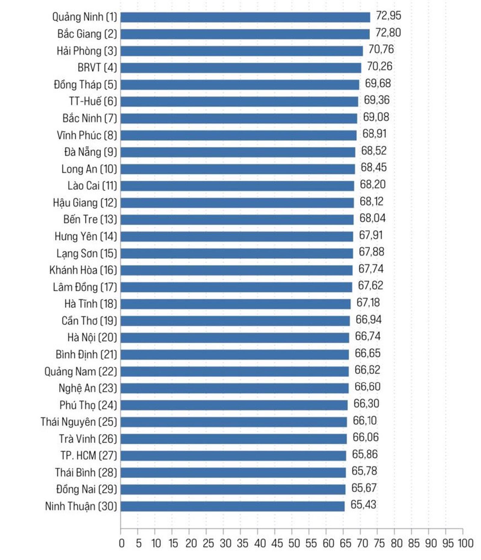 Xếp thứ 2 là Bắc Giang với 72,80 điểm, Hải Phòng xếp thứ 3 với 70,76 điểm, Bà Rịa - Vũng Tàu xếp thứ 4 với 70,26 điểm, Đồng Tháp được 69,68 điểm, xếp thứ 5.