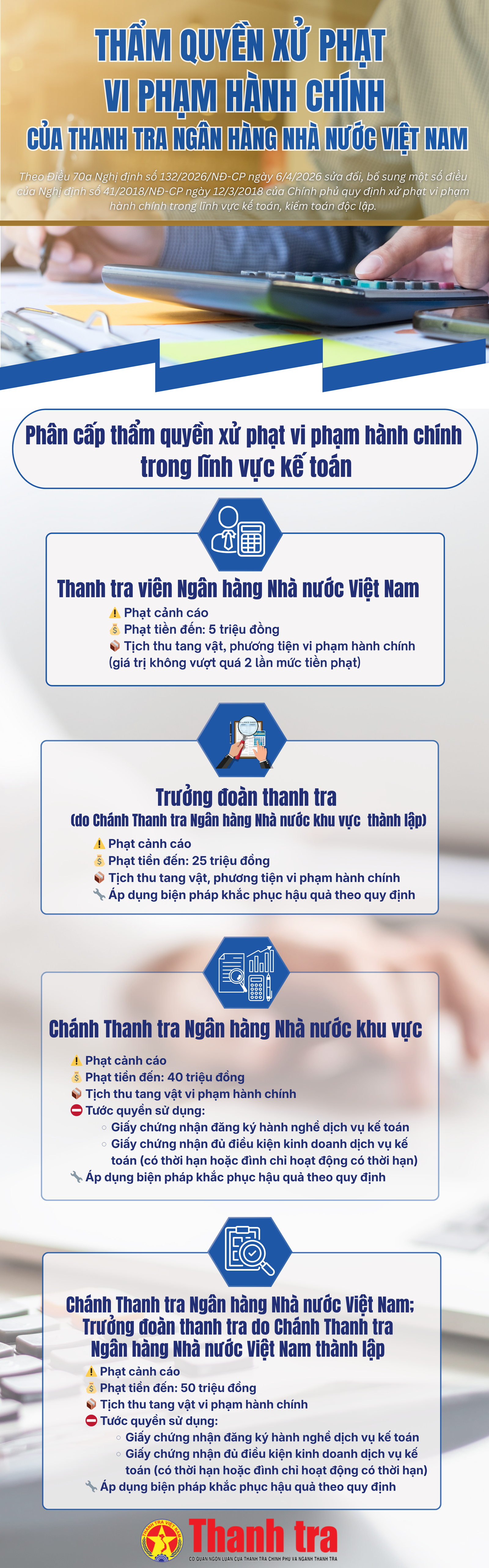 (Thanh tra) - Chính phủ vừa ban hành Nghị định số 132/2026/NĐ-CP sửa đổi, bổ sung quy định về xử phạt vi phạm hành chính trong lĩnh vực kế toán, kiểm toán độc lập. Trong đó, bổ sung quy định cụ thể và chi tiết về thẩm quyền xử phạt của các cấp bậc thuộc Thanh tra Ngân hàng Nhà nước Việt Nam.