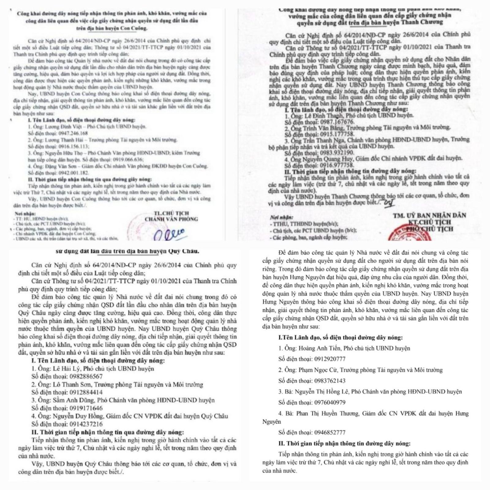 Nhiều huyện, thành, thị và cấp xã của Nghệ An đã công khai văn bản, có đường dây nóng tiếp nhận phản ánh, kiến nghị trong quá trình cấp GCNQSDĐ. Ảnh: XT