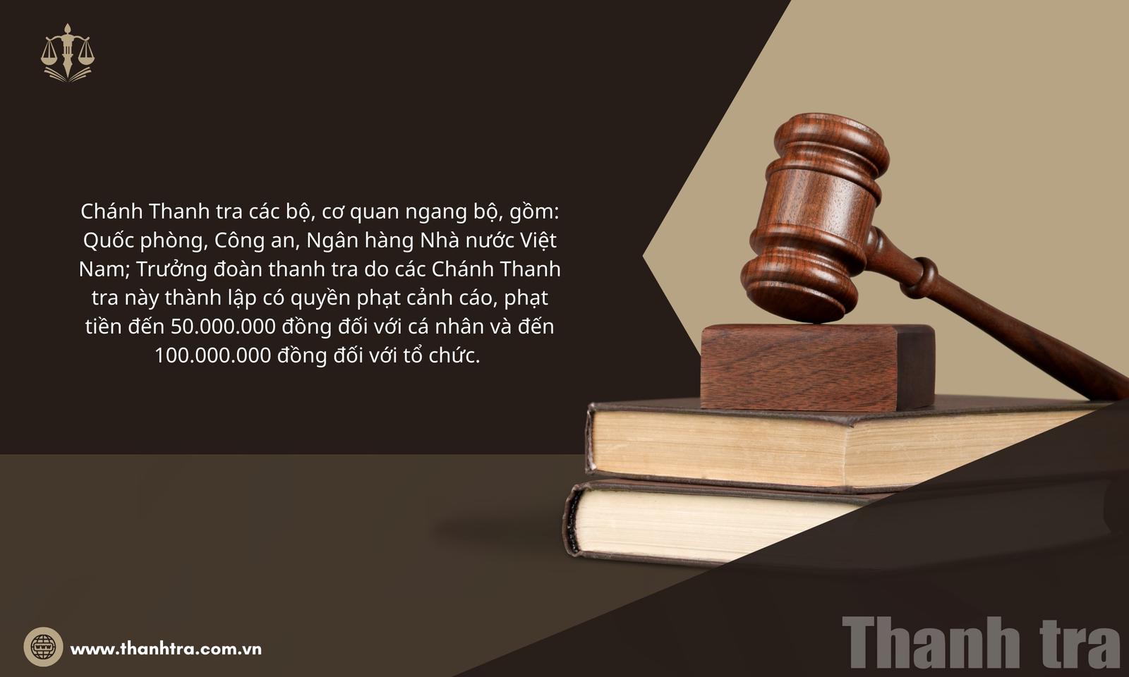 Cuối cùng, Nghị định quy định thẩm quyền xử phạt ở mức cao nhất trong nhóm cơ quan thanh tra đối với Chánh Thanh tra các bộ, cơ quan ngang bộ, gồm: Quốc phòng, Công an, Ngân hàng Nhà nước Việt Nam, cũng như trưởng đoàn thanh tra do các Chánh Thanh tra này thành lập. Các chủ thể này có quyền phạt cảnh cáo, phạt tiền đến 50.000.000 đồng đối với cá nhân và đến 100.000.000 đồng đối với tổ chức. Đồng thời, được áp dụng các biện pháp khắc phục hậu quả theo quy định của Nghị định. Quy định này bảo đảm sự tương xứng giữa thẩm quyền xử phạt và vị trí, trách nhiệm của người đứng đầu cơ quan thanh tra.