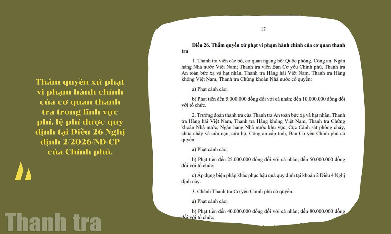 (Thanh tra) - Nghị định số 2/2026/NĐ-CP ngày 1/1/2026 của Chính phủ quy định xử phạt vi phạm hành chính trong lĩnh vực phí và lệ phí đã thiết lập khuôn khổ pháp lý đầy đủ, thống nhất cho việc xử lý các hành vi vi phạm liên quan đến quản lý, thu, nộp, sử dụng phí và lệ phí. Trong đó, thẩm quyền xử phạt của cơ quan thanh tra được quy định cụ thể.