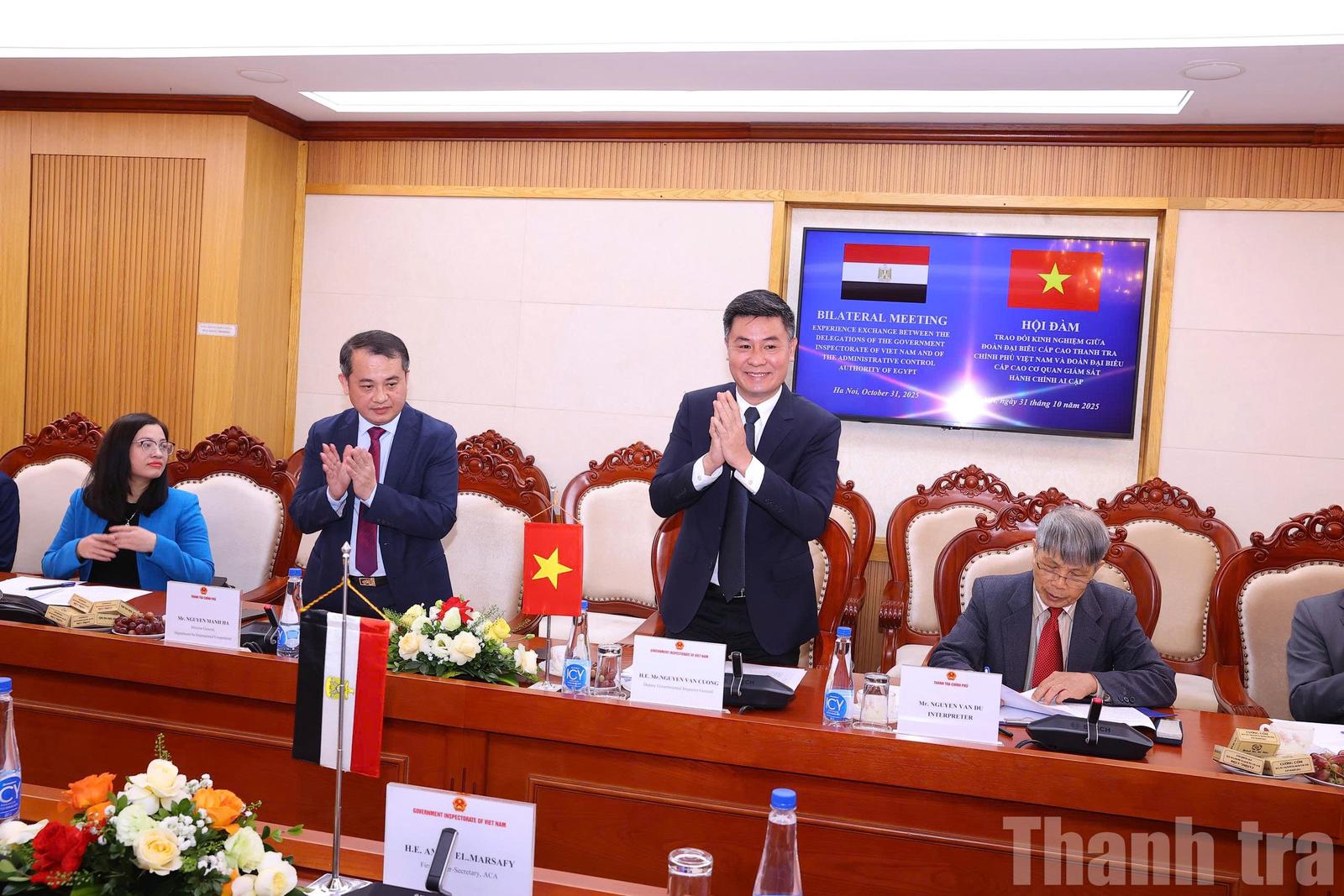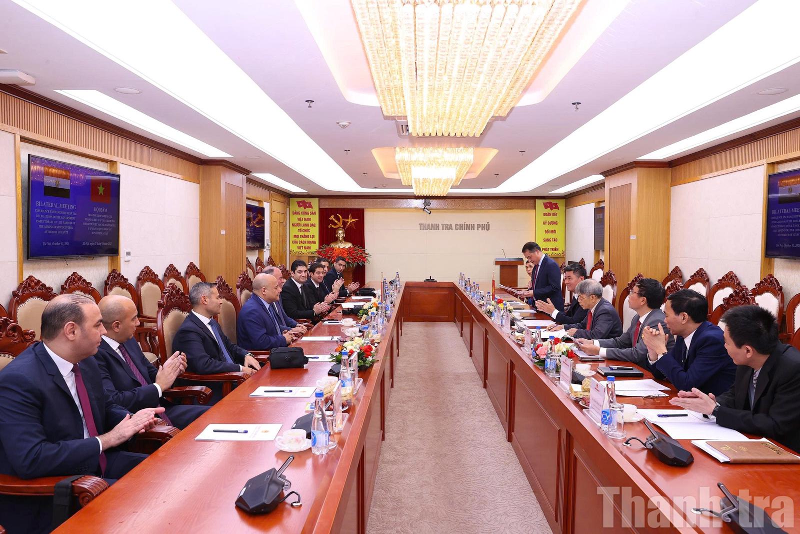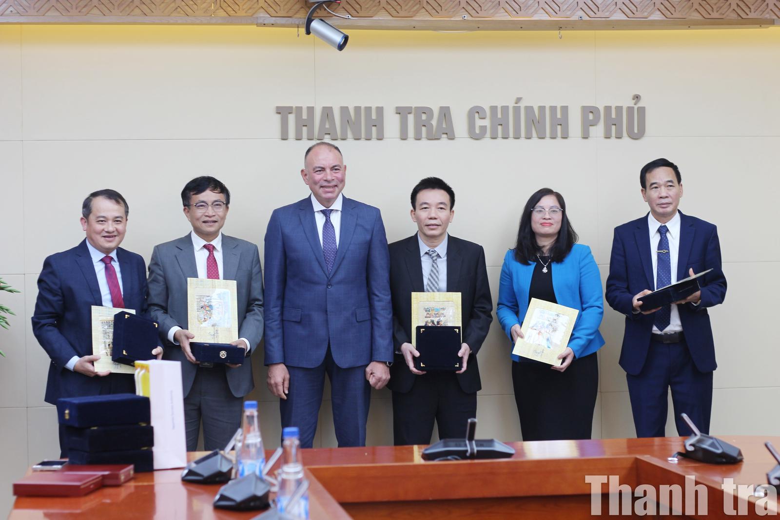 Phó Tổng Thanh tra Chính phủ Nguyễn Văn Cường tiếp và hội đàm với Đoàn đại biểu cấp cao Cơ quan Giám sát Hành chính Ai Cập do ông Amro Mohamed Elmarsafy, Phó Quốc vụ khanh, Cơ quan Giám sát Hành chính Ai Cập làm Trưởng đoàn. Ảnh: LP