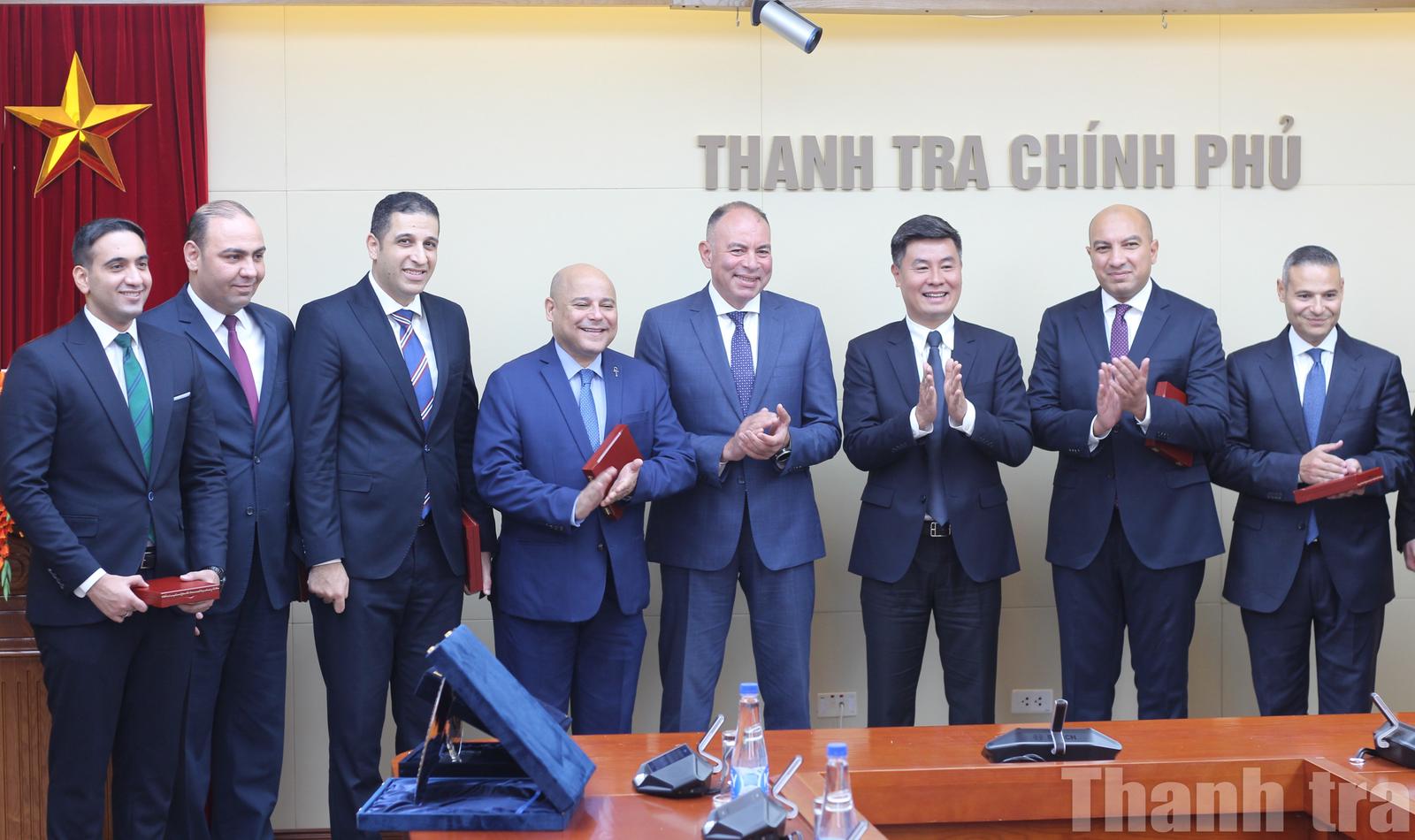 Phó Tổng Thanh tra Chính phủ Nguyễn Văn Cường chụp ảnh lưu niệm cùng các đại biểu Đoàn Cơ quan Giám sát Hành chính Ai Cập. Ảnh: LP