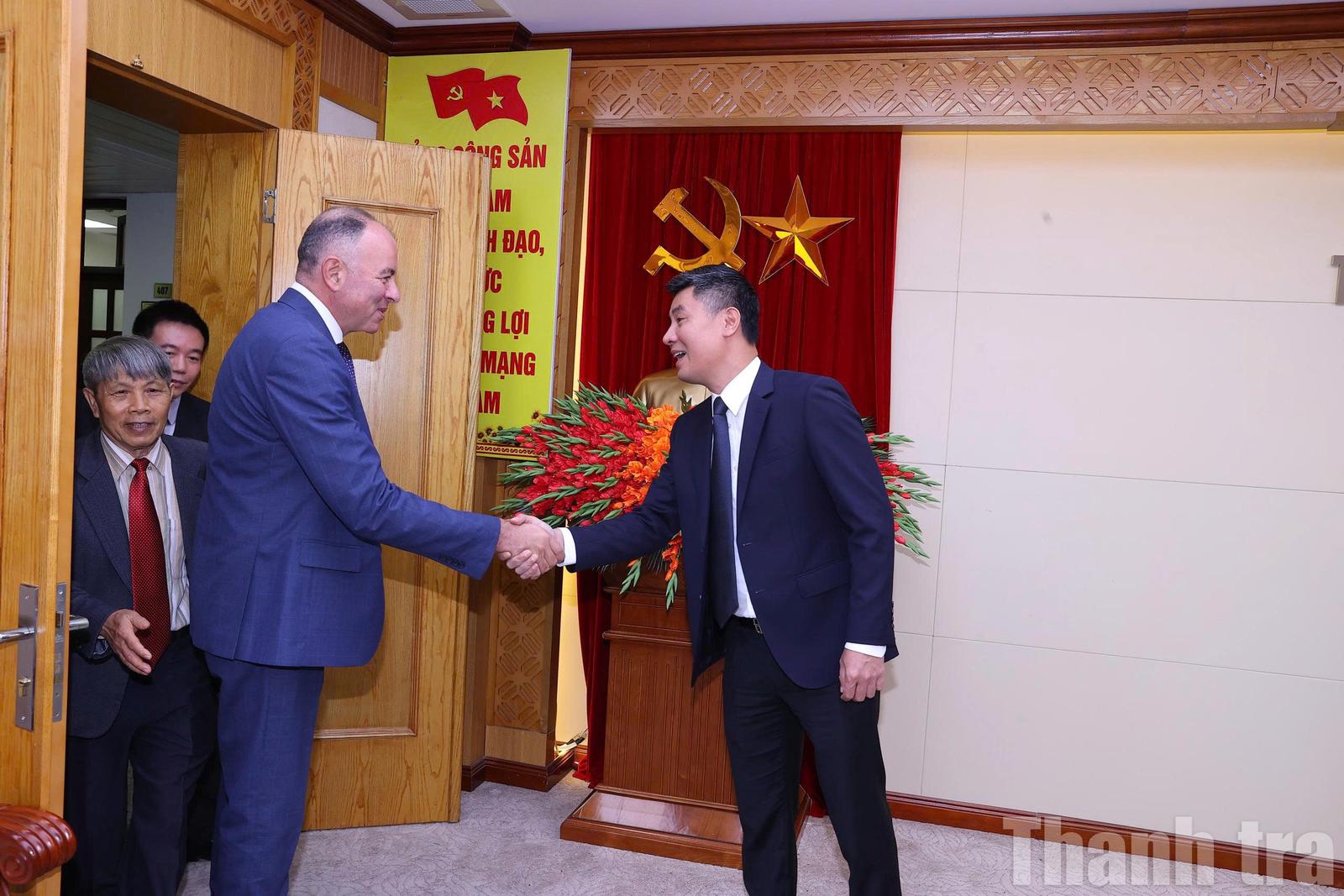 Phó Tổng Thanh tra Nguyễn Văn Cường vui mừng chào đón ông Amro Mohamed Elmarsafy, Phó Quốc vụ khanh cùng các đồng nghiệp Cơ quan Giám sát Hành chính Ai Cập tới thăm và làm việc với Thanh tra Chính phủ. Ảnh: LP