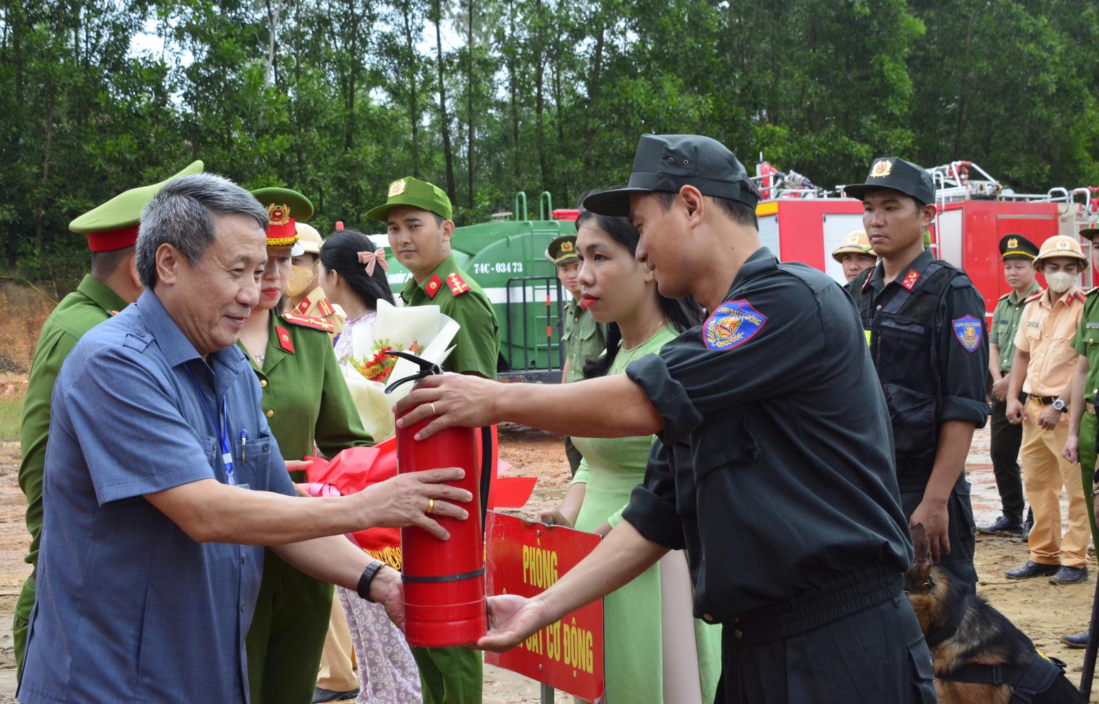 Phó Chủ tịch Thường trực UBND tỉnh Quảng Trị Hà Sỹ Đồng tặng các thiết bị chữa cháy cho các cá nhân, tập thể tham gia buổi thực tập. Ảnh: Minh Tân.