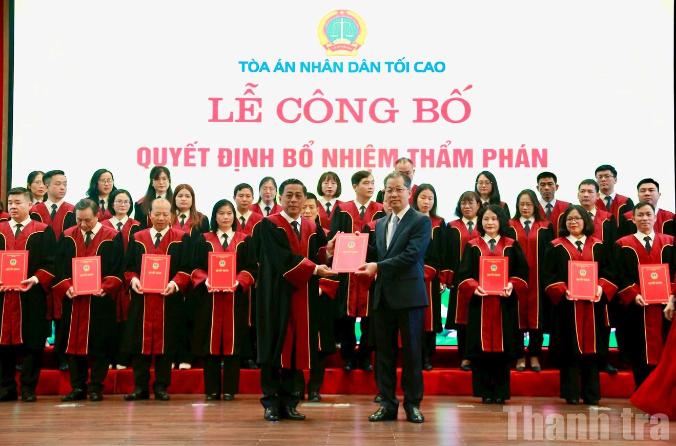 Chánh án Tòa án Nhân dân Tối cao Nguyễn Văn Quảng trao Quyết định bổ nhiệm Thẩm phán Tòa án Nhân dân. Ảnh: ND