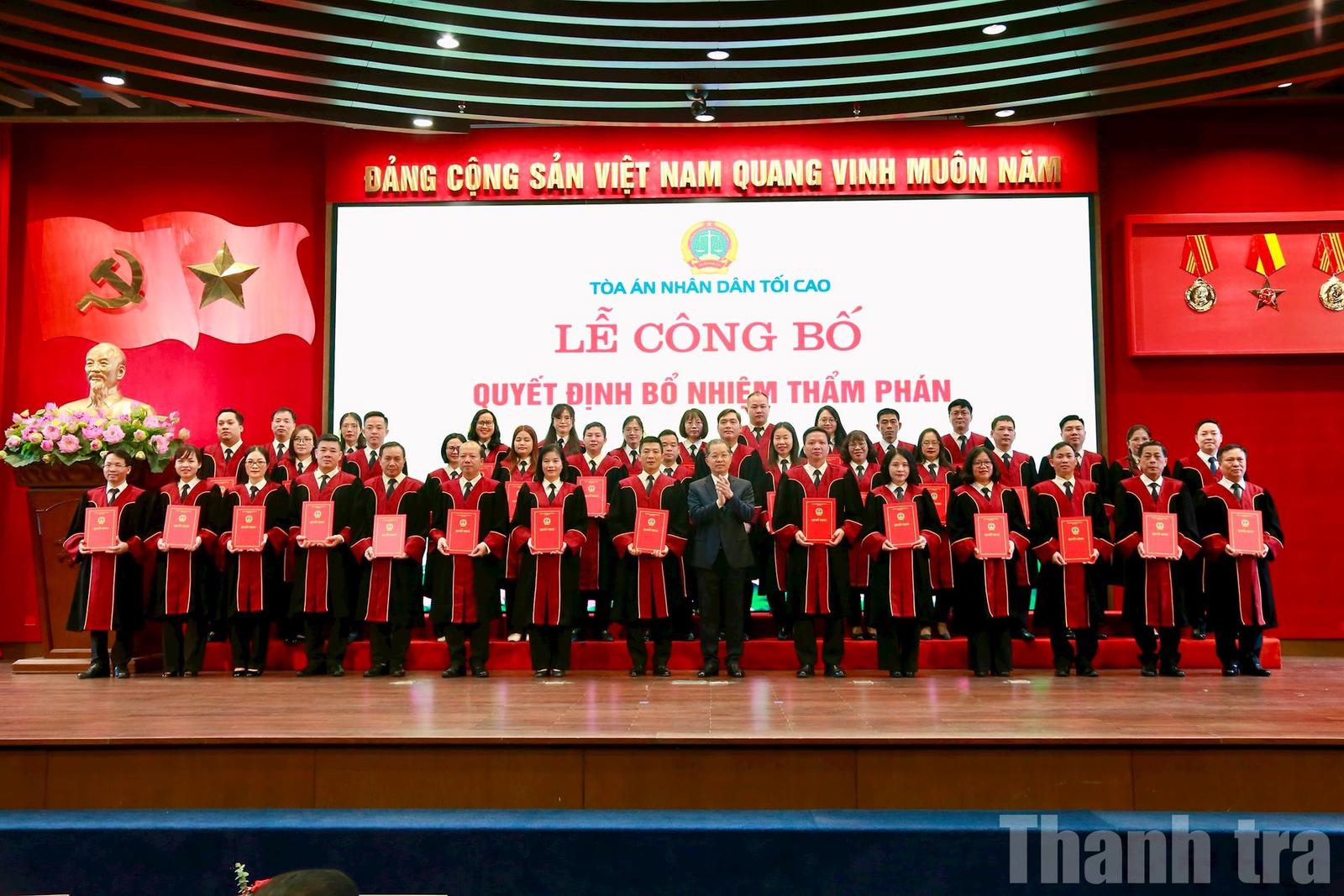Chánh án Toà án Nhân dân Tối cao Nguyễn Văn Quảng chúc mừng các Thẩm phán được bổ nhiệm. Ảnh: ND