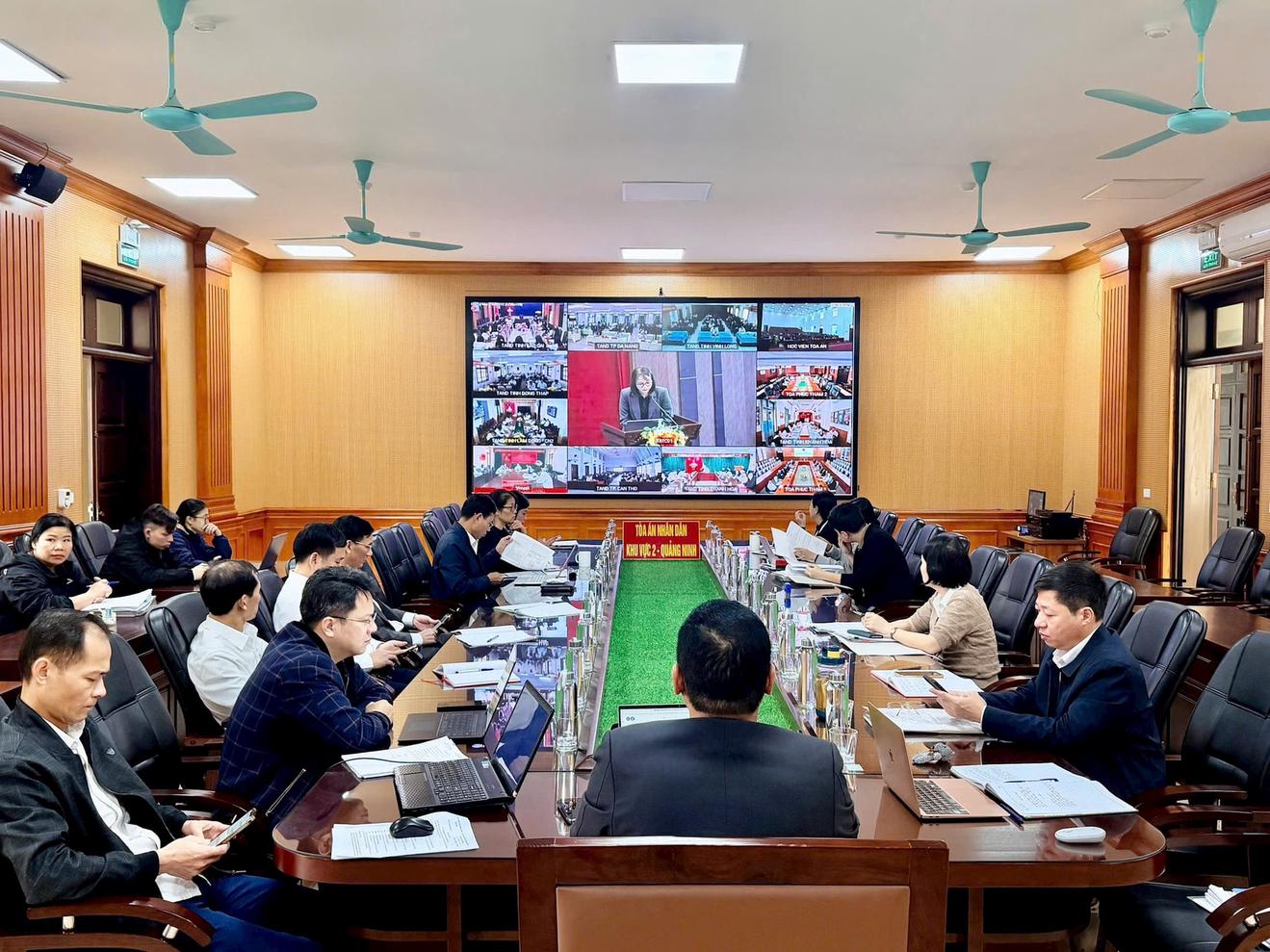 TAND khu vực 2 - Quảng Ninh tại một buổi họp trực tuyến về công tác tòa án. Ảnh: TV