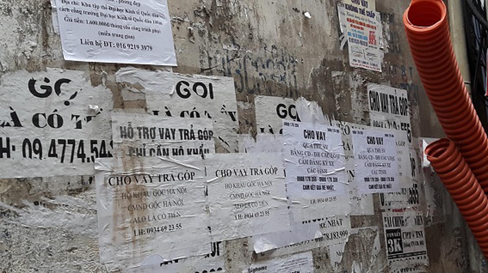 Quảng cáo, rao vặt dày đặc trên tường các hộ dân tại một ngõ Đường Lê Thanh Nghị. Ảnh: O.H