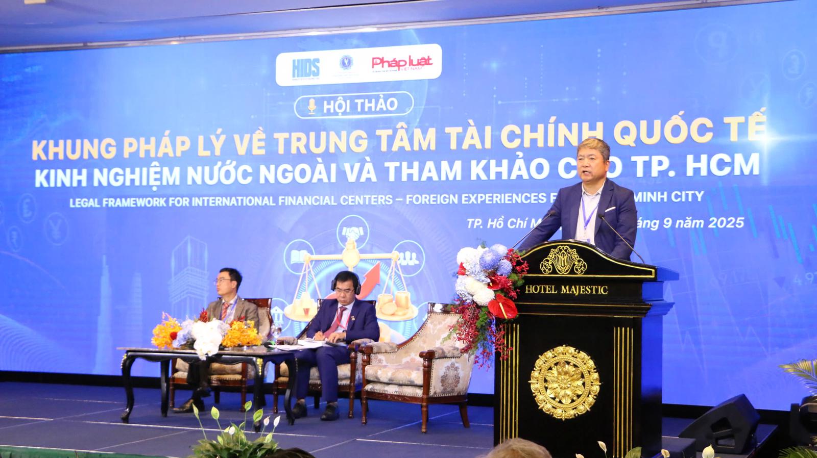 GS.TS Võ Xuân Vinh (bên phải) tại Hội thảo Khung pháp lý TTTCQT kinh nghiệm nước ngoài và tham khảo cho TP HCM. Ảnh: Đình Thuyết