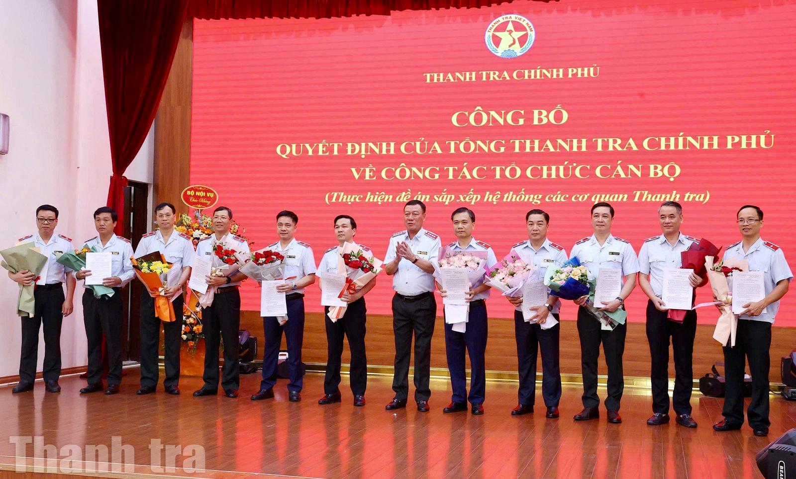 Tổng Thanh tra Chính phủ Đoàn Hồng Phong trao các quyết đinh về công tác tổ chức cán bộ thực hiện theo đề án sắp xếp cơ quan thanh tra. Ảnh: T.H