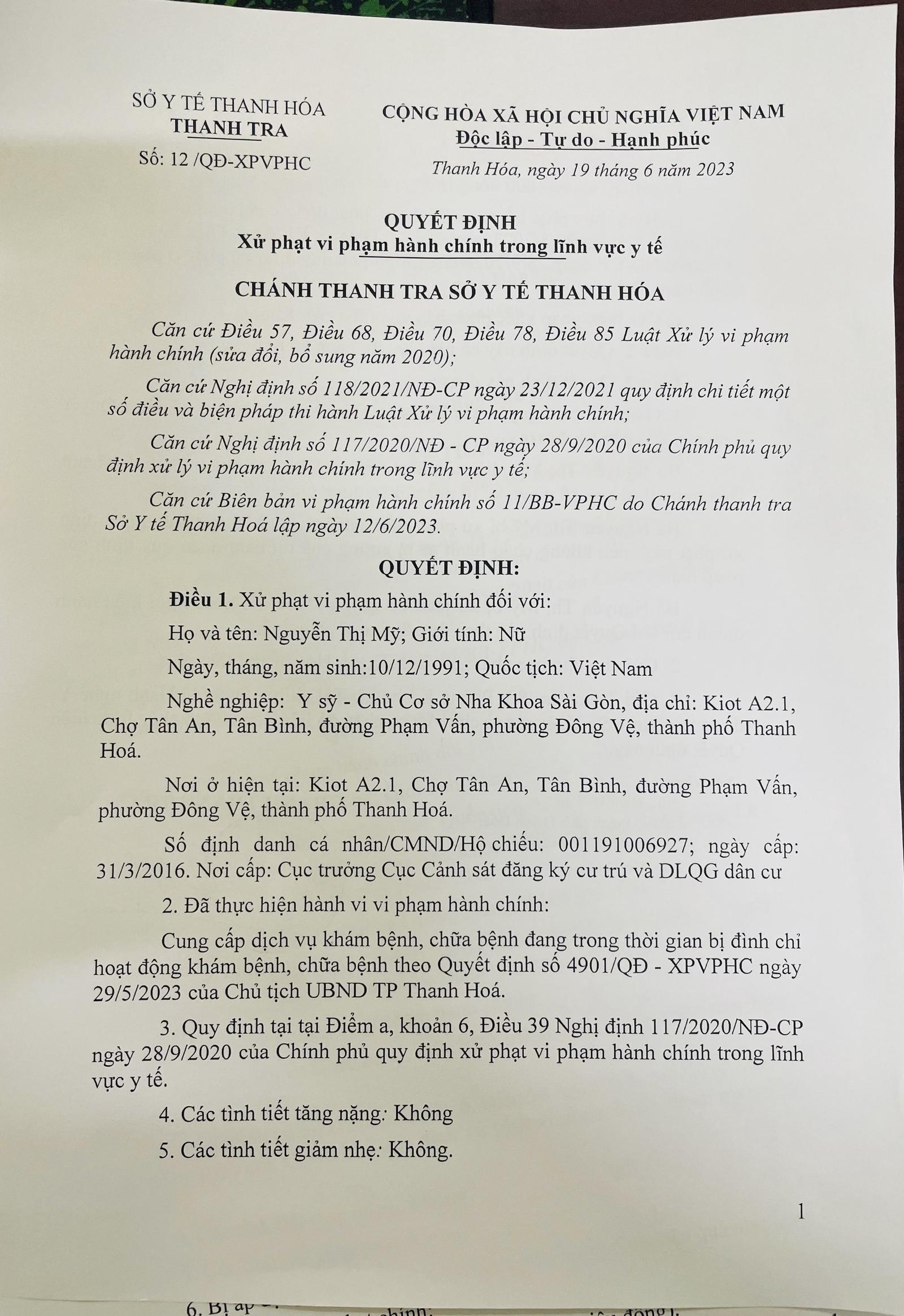 Xử phạt vi phạm hành chính đối với bà Nguyễn Thị Mỹ, sinh năm 1991, là y sĩ - chủ Cơ sở Nha khoa Sài Gòn, có địa chỉ tại kios A2.1, chợ Tân An, Tân Bình, đường Phạm Vấn, phường Đông Vệ, TP Thanh Hóa, đã thực hiện hành vi vi phạm hành chính cung cấp dịch vụ khám bệnh, chữa bệnh đang trong thời gian bị đình chỉ hoạt động khám bệnh, chữa bệnh với số tiền 45 triệu đồng. Ngoài ra, cơ sở còn chịu hình thức phạt bổ sung là đình chỉ hoạt động trong thời hạn 18 tháng kể từ ngày 29/5/2023.