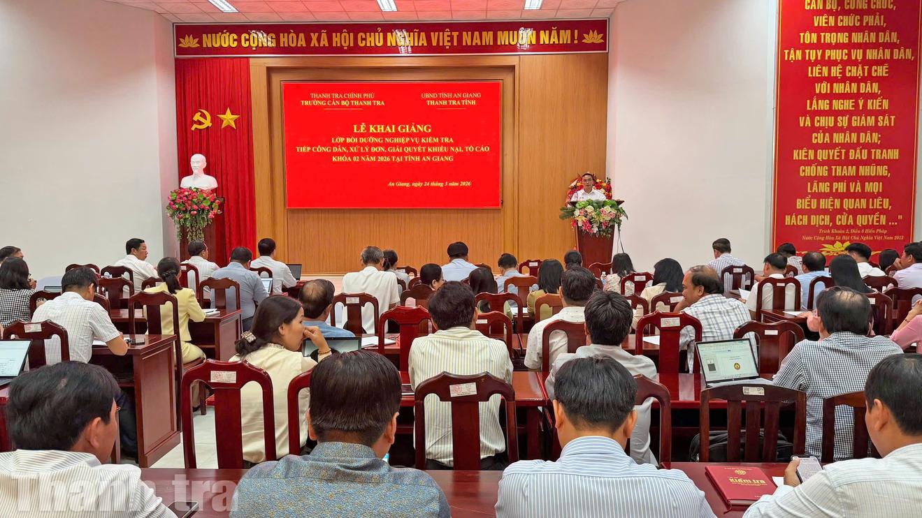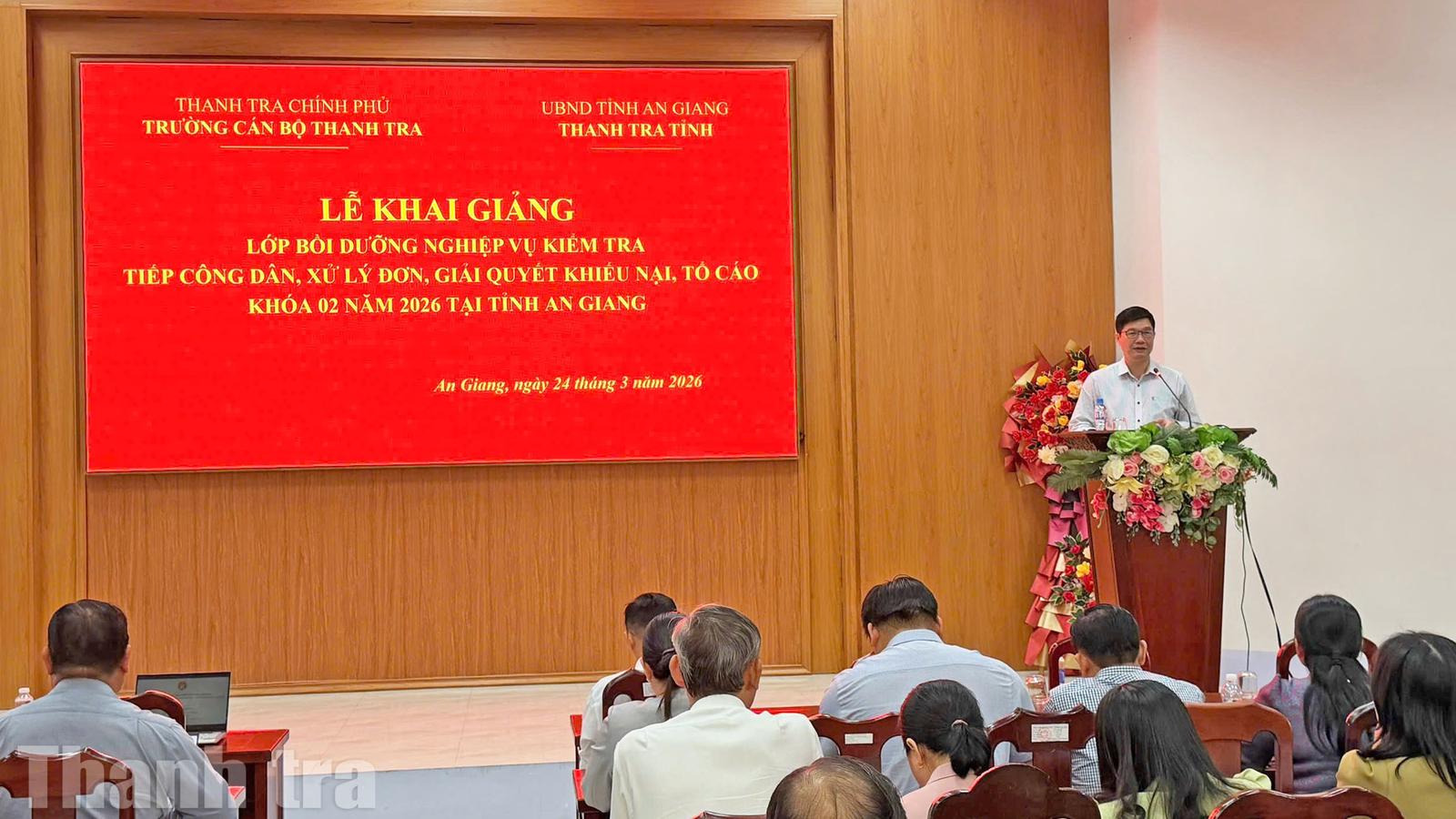 Ngày 24/3, Trường Cán bộ Thanh tra phối hợp với Thanh tra tỉnh An Giang tổ chức lễ khai giảng lớp bồi dưỡng nghiệp vụ kiểm tra, tiếp công dân, xử lý đơn, giải quyết khiếu nại, tố cáo khóa 02 năm 2026, dành cho đội ngũ cán bộ, công chức làm công tác thanh tra, kiểm tra, xử lý đơn thư và tiếp công dân trên địa bàn.