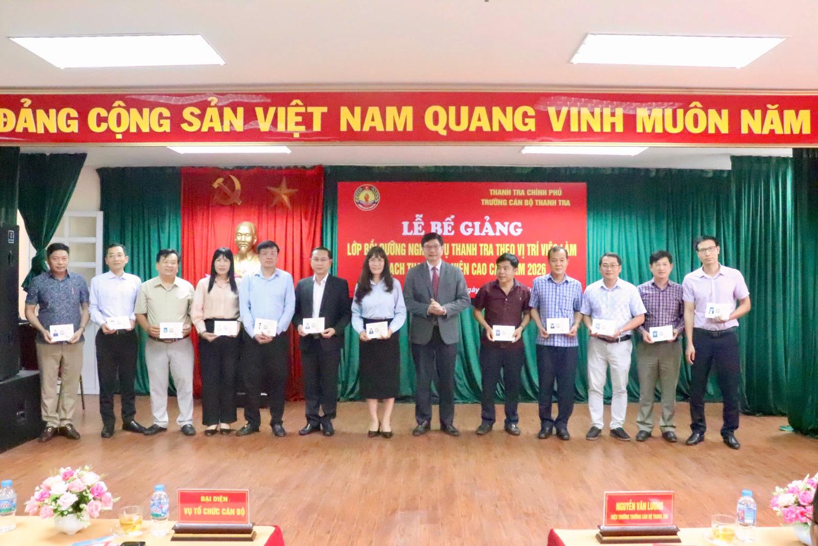 Lãnh đạo Trường Cán bộ Thanh tra trao chứng chỉ hoàn thành chương trình bồi dưỡng nghiệp vụ thanh tra theo vị trí việc làm ngạch thanh tra viên cao cấp năm 2026 cho hơn 170 học viên của lớp. Ảnh: TH