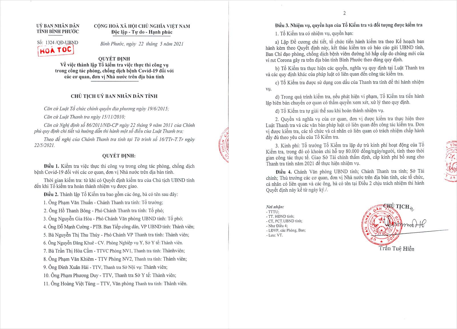 (Thanh tra) - Trước tình hình dịch bệnh Covid-19 diễn biến phức tạp, nhằm xem xét, đánh giá đúng việc thực thi nhiệm vụ trong công tác phòng, chống dịch bệnh, Chủ tịch UBND tỉnh Bình Phước đã quyết định thành lập tổ kiểm tra việc thực thi công vụ trong công tác phòng, chống dịch Covid-19 đối với các cơ quan, đơn vị trên địa bàn.