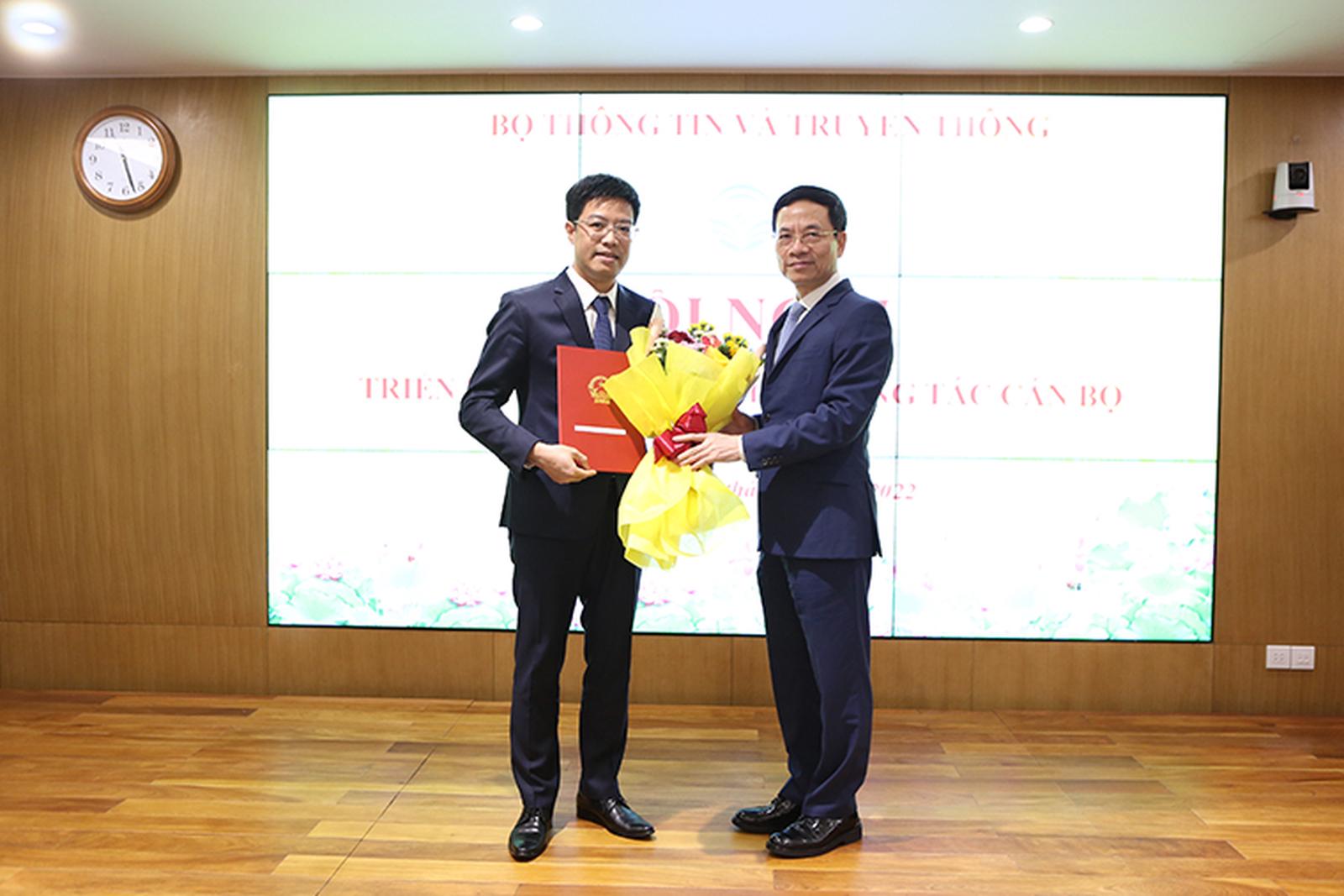 Bộ trưởng Bộ Thông tin và Truyền thông Nguyễn Mạnh Hùng trao quyết định và tặng hoa chúc mừng tân Phó Chánh Thanh tra Nguyễn Thành Chung. Ảnh: Đức Huy