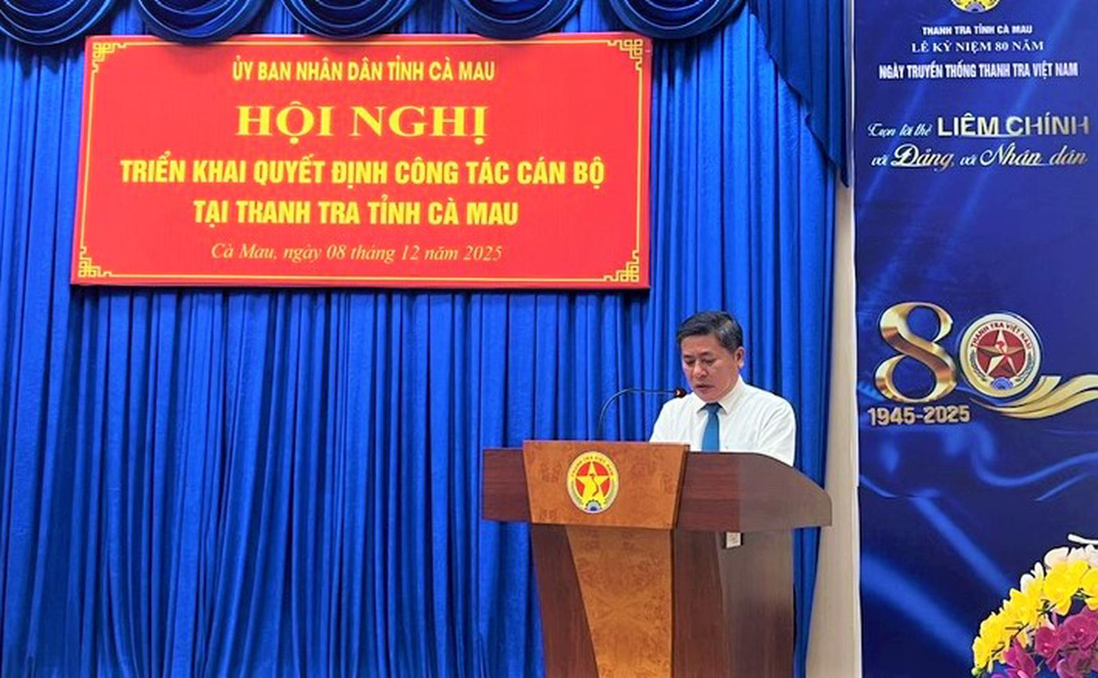 (Thanh tra) - Ngày 9/12/2025, thông tin từ Thanh tra tỉnh Cà Mau, UBND tỉnh Cà Mau đã tổ chức Hội nghị công bố quyết định bổ nhiệm Chánh Thanh tra tỉnh. Chủ tịch UBND tỉnh Lữ Quang Ngời đã đến dự.