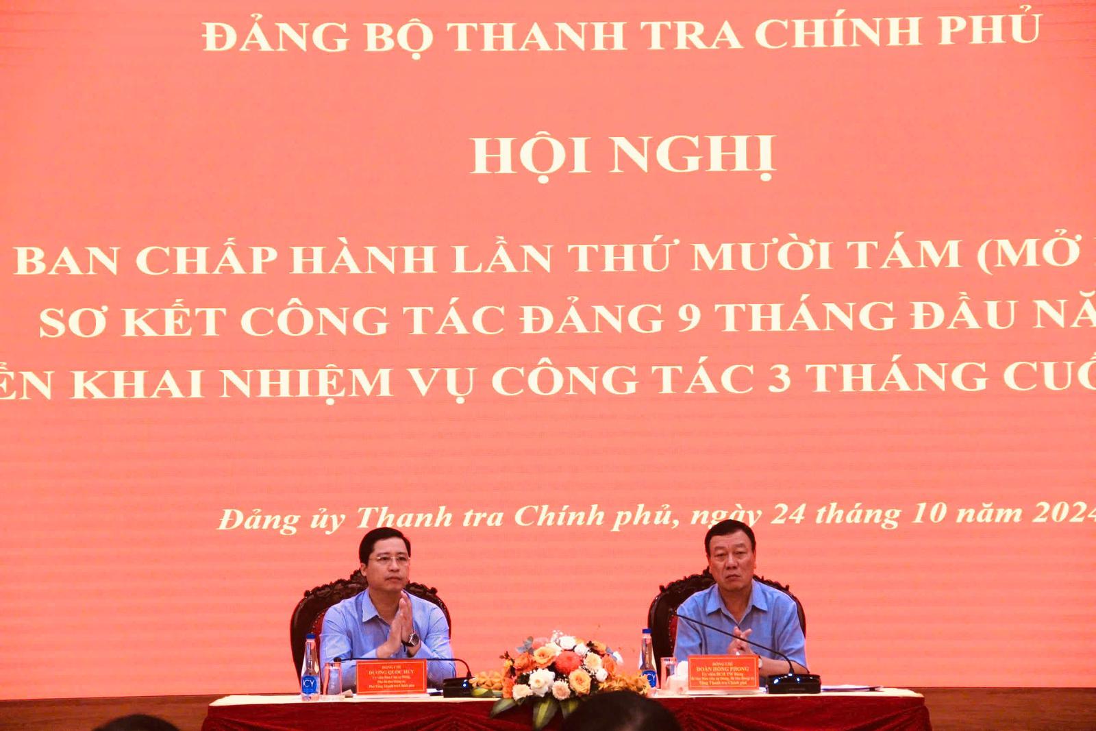 Đồng chí Đoàn Hồng Phong, Bí thư Đảng uỷ, Tổng Thanh tra Chính phủ (bìa phải); đồng chí Dương Quốc Huy, Phó Bí thư Đảng uỷ, Phó Tổng Thanh tra Chính phủ đồng chủ trì hội nghị