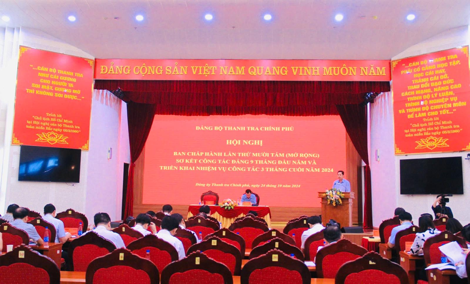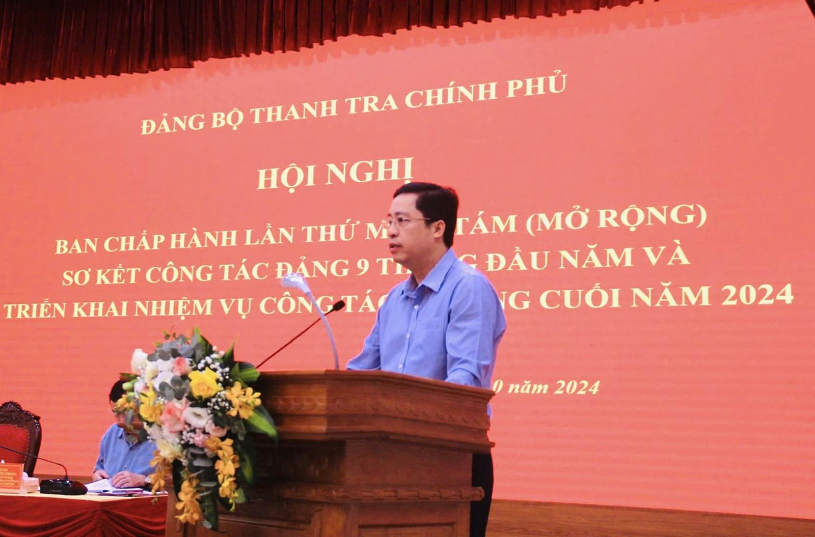 Báo cáo tại hội nghị, Phó Bí thư Đảng uỷ, Phó Tổng Thanh tra Chính phủ Dương Quốc Huy cho biết, 9 tháng đầu năm, bám sát sự lãnh đạo, chỉ đạo của Trung ương và Đảng uỷ Khối các cơ quan Trung ương, Đảng uỷ Thanh tra Chính phủ tiếp tục đổi mới nội dung, phương thức lãnh đạo; kịp thời bổ sung Uỷ viên Ban Chấp hành Đảng bộ, Ban Thường vụ và Phó Bí thư Đảng uỷ; tăng cường phối hợp với Ban Cán sự Đảng và lãnh đạo Thanh tra Chính phủ tập trung lãnh đạo, chỉ đạo, triển khai thực hiện các mục tiêu, nhiệm vụ ngay từ đầu năm 2024.