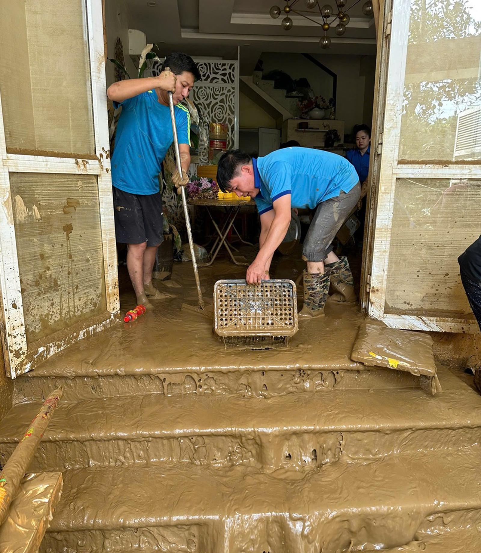 Chi đoàn Thanh niên, cán bộ, công chức Thanh tra tỉnh Cao Bằng hỗ trợ thu dọn bùn đất tràn vào trong nhà, dù nền nhà khá cao. Ảnh: TH
