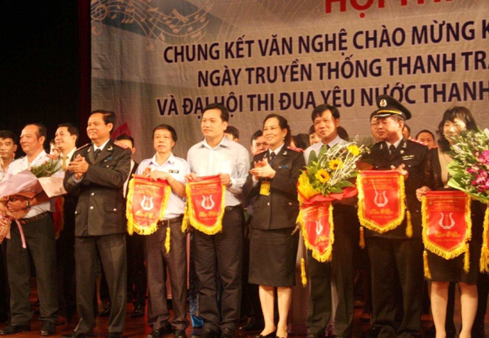 Tổng Thanh tra Huỳnh Phong Tranh, Phó Tổng Thanh tra Lê Thị Thủy chia vui, tặng hoa, cờ cho 16 cụm, khối tham dự hội thi.