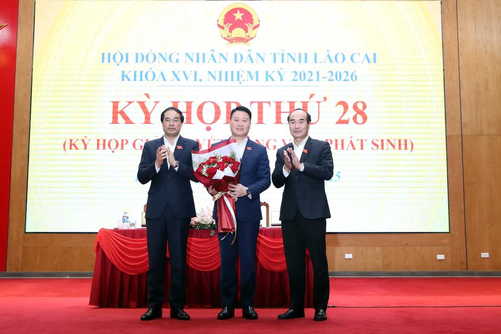 Lãnh đạo tỉnh Lào Cai tặng hoa chúc mừng tân Ủy viên UBND tỉnh Lào Cai nhiệm kỳ 2021 - 2026 Hà Đức Minh. Ảnh: ND