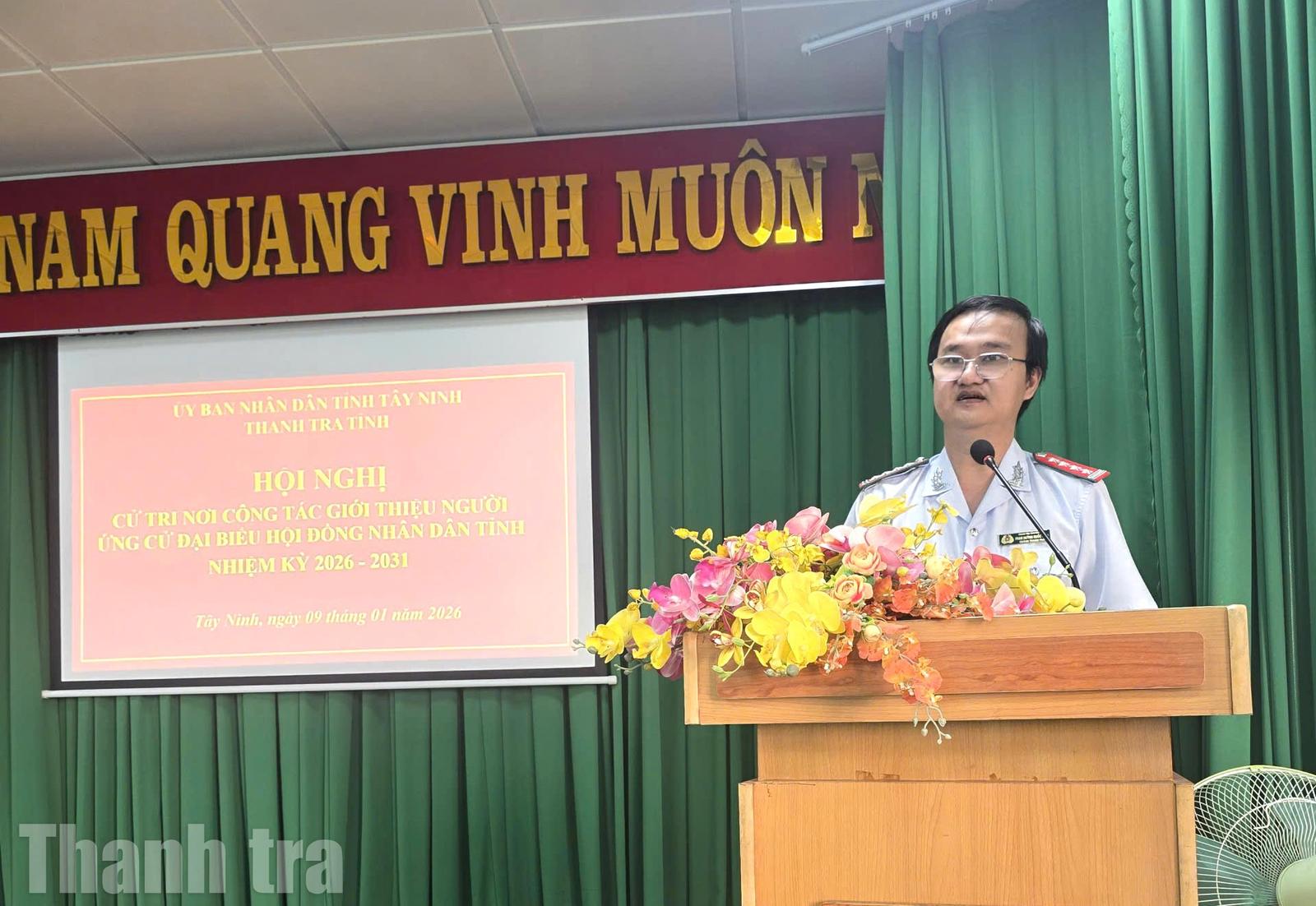 Ngày 9/1, Thanh tra tỉnh Tây Ninh tổ chức hội nghị cử tri nơi công tác để giới thiệu người ứng cử đại biểu HĐND tỉnh Tây Ninh, nhiệm kỳ 2026 - 2031.