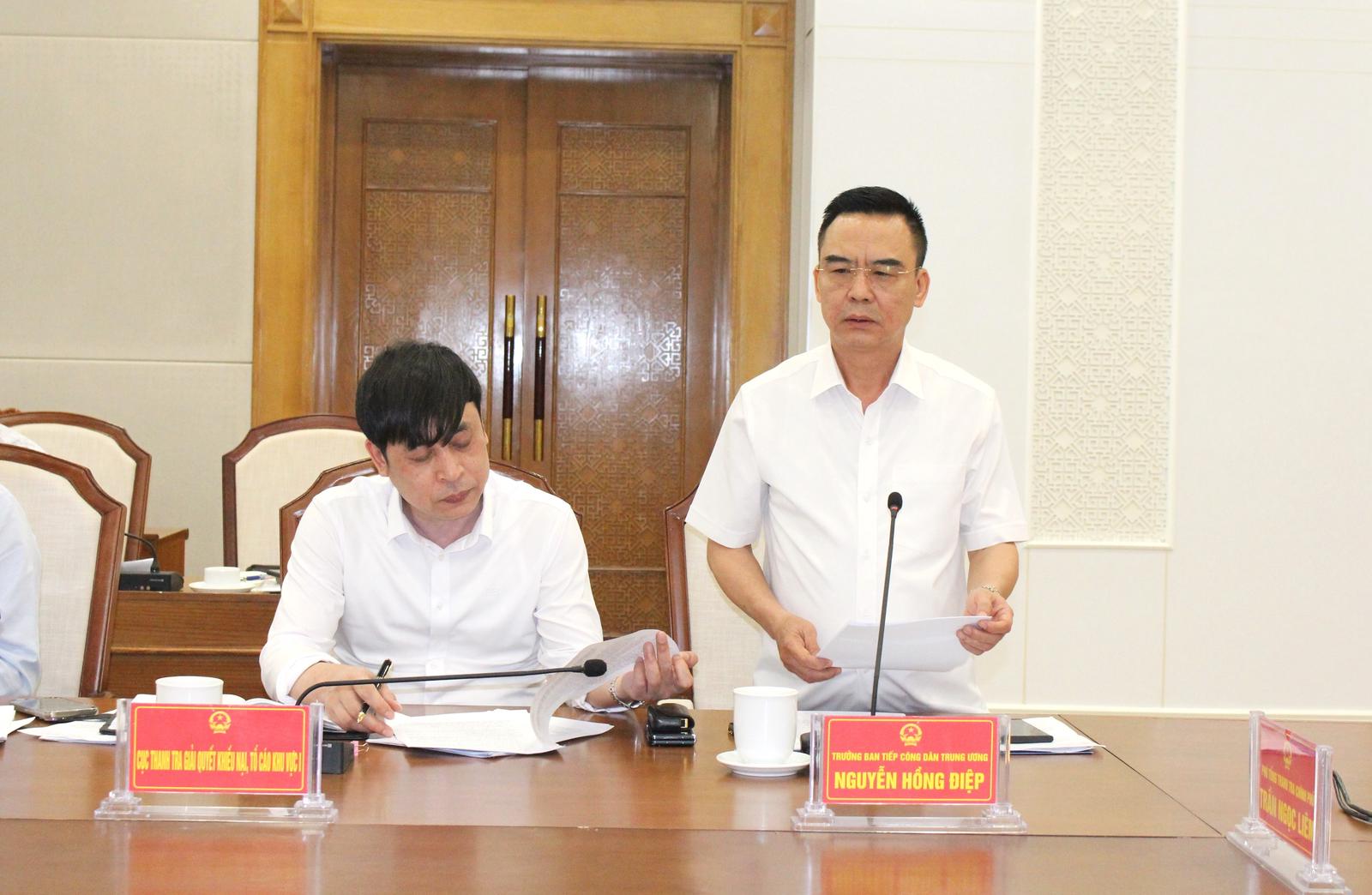 Trưởng Ban Tiếp công dân Trung ương Nguyễn Hồng Điệp phát biểu ý kiến tại buổi làm việc. Ảnh: Trọng Tài