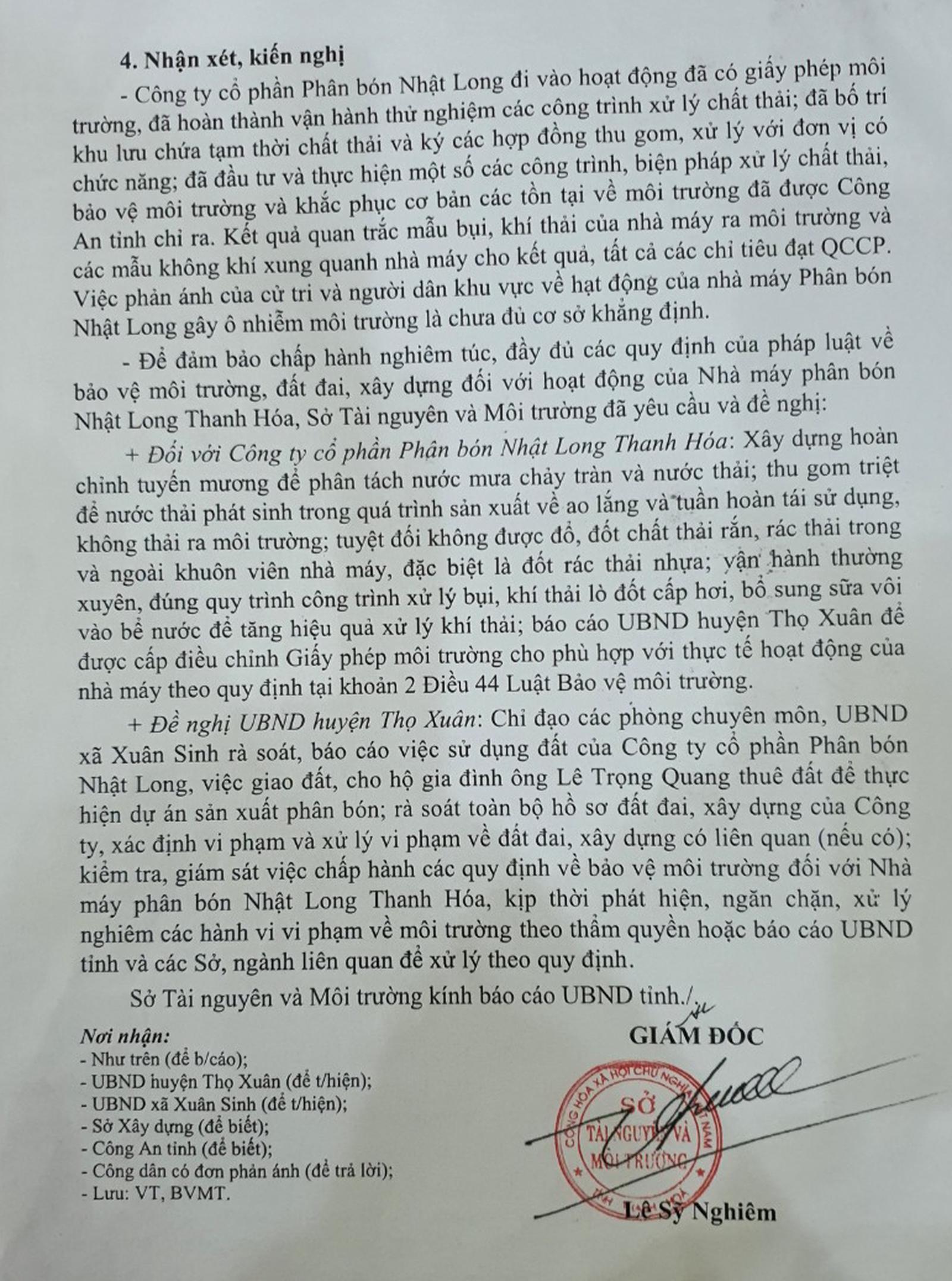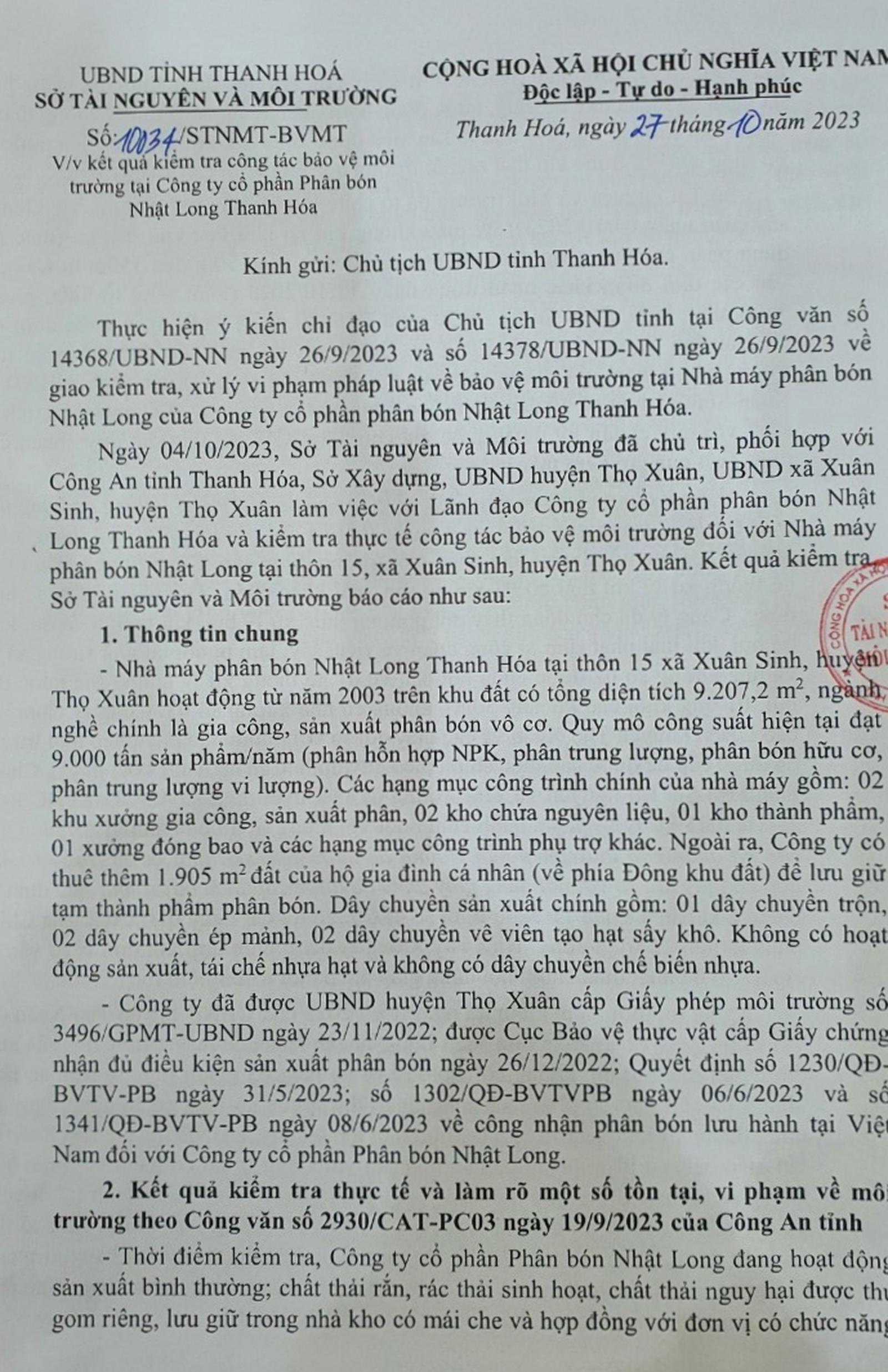 Sau khi kiểm tra, ngày 27/10/2023, Sở TN&MT tỉnh Thanh Hóa đã có báo cáo gửi Chủ tịch UBND tỉnh, trong đó có nội dung nhận xét, kiến nghị Công ty Phân bón Nhật Long đi vào hoạt động đã có giấy phép môi trường, đã vận hành thử nghiệm các công trình xử lý chất thải; đã bố trí khu lưu chứa tạm thời chất thải và ký hợp đồng thu gom, xử lý với các đơn vị có chức năng; đã đầu tư và thực hiện một số các công trình, biện pháp xử lý chất thải, bảo vệ môi trường và khắc phục cơ bản các tồn tại về môi trường đã được Công an tỉnh Thanh Hóa chỉ ra.