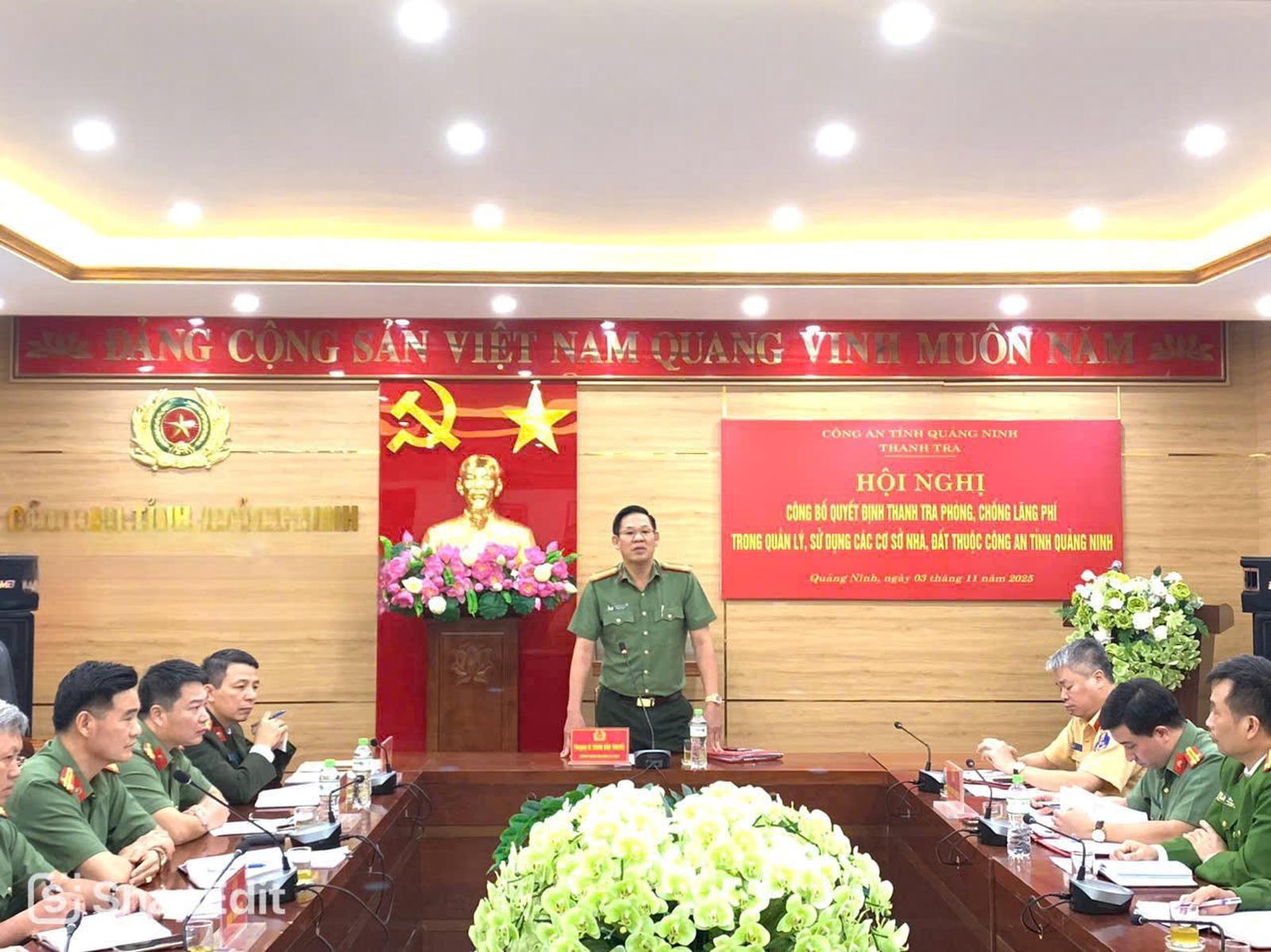 Hội nghị công bố quyết định thanh tra chuyên đề về phòng, chống lãng phí trong quản lý, sử dụng các cơ sở nhà, đất thuộc Công an tỉnh Quảng Ninh tổ chức chiều 3/11/2025. Ảnh: CA Quảng Ninh