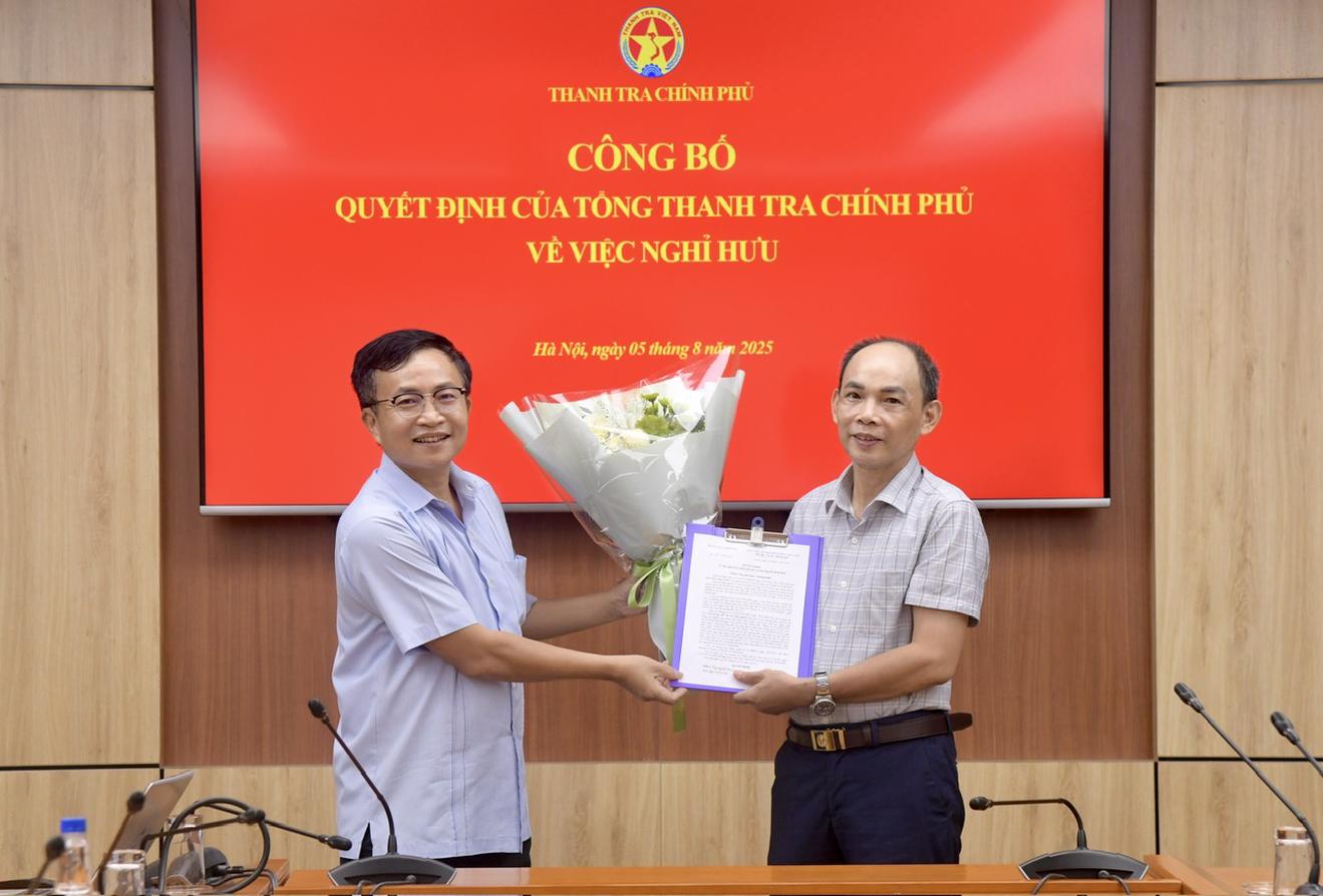 Vụ trưởng Vụ Pháp chế Trần Đăng Vinh trao quyết định nghỉ hưu cho ông Nguyễn Đình Bính. Ảnh: Trang Nguyệt