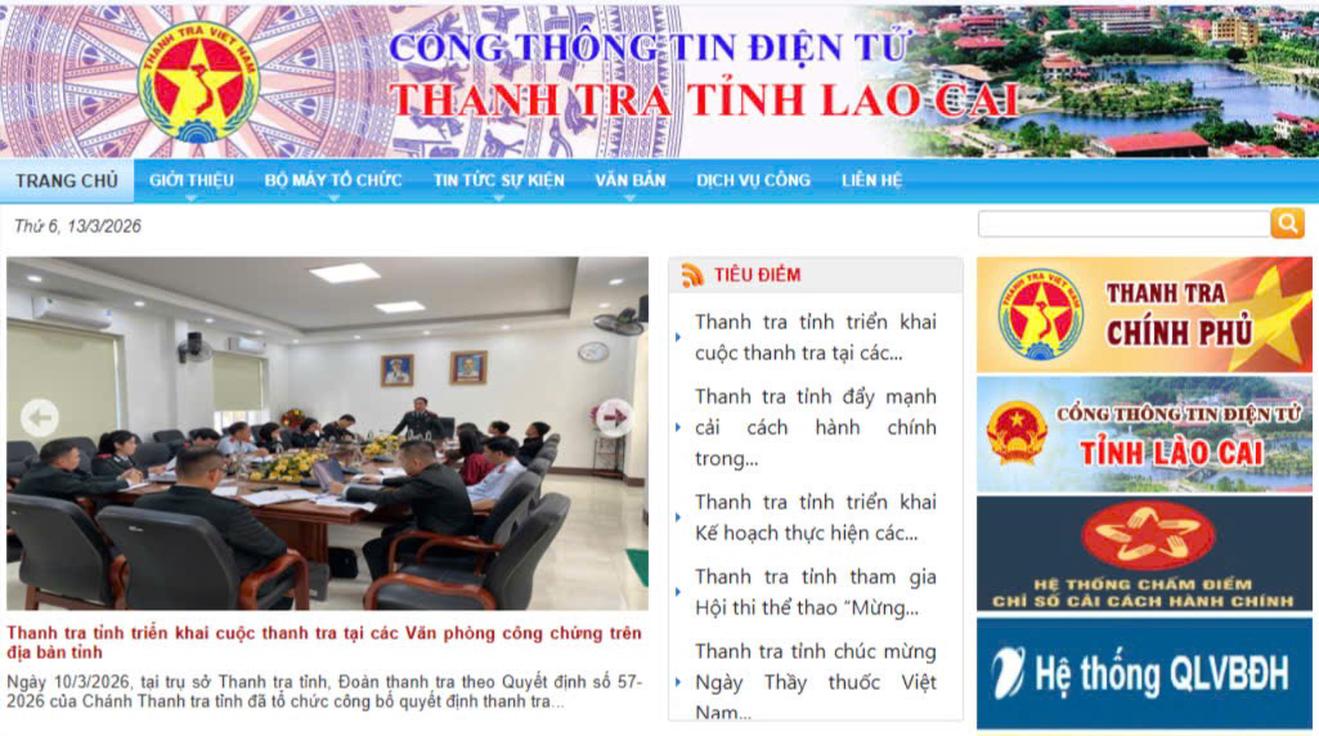 Giao diện Cổng Thông tin điện tử Thanh tra tỉnh Lào Cai, kênh thông tin chính thức cung cấp các tin tức hoạt động và văn bản chỉ đạo điều hành của cơ quan. Ảnh: Bùi Bình