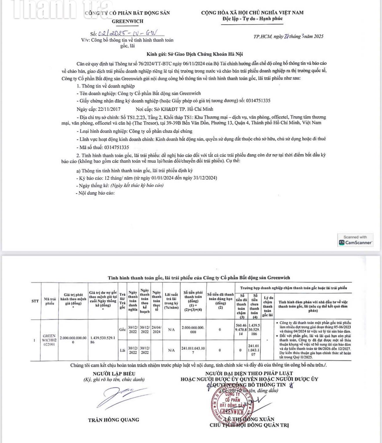 Công ty Cổ phần Bất động sản Greenwich gửi công bố thông tin về tình hình thanh toán gốc, lãi cho Sở Giao dịch Chứng khoán Hà Nội ngày 28/3/2025. Ảnh: TQ
