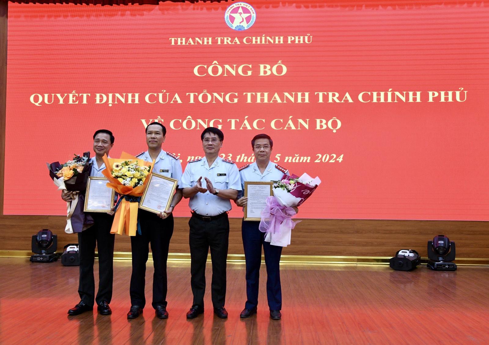 Phó Tổng Thanh tra Lê Sỹ Bảy trao quyết định và tặng hoa chúc mừng các tân Phó Cục trưởng. Ảnh: PV