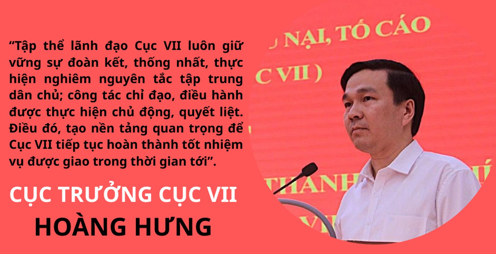 Ông Hoàng Hưng khẳng định, tập thể lãnh đạo Cục VII luôn giữ vững sự đoàn kết, thống nhất, thực hiện nghiêm nguyên tắc tập trung dân chủ; công tác chỉ đạo, điều hành được thực hiện chủ động, quyết liệt. Điều đó, tạo nền tảng quan trọng để Cục VII tiếp tục hoàn thành tốt nhiệm vụ được giao trong thời gian tới.