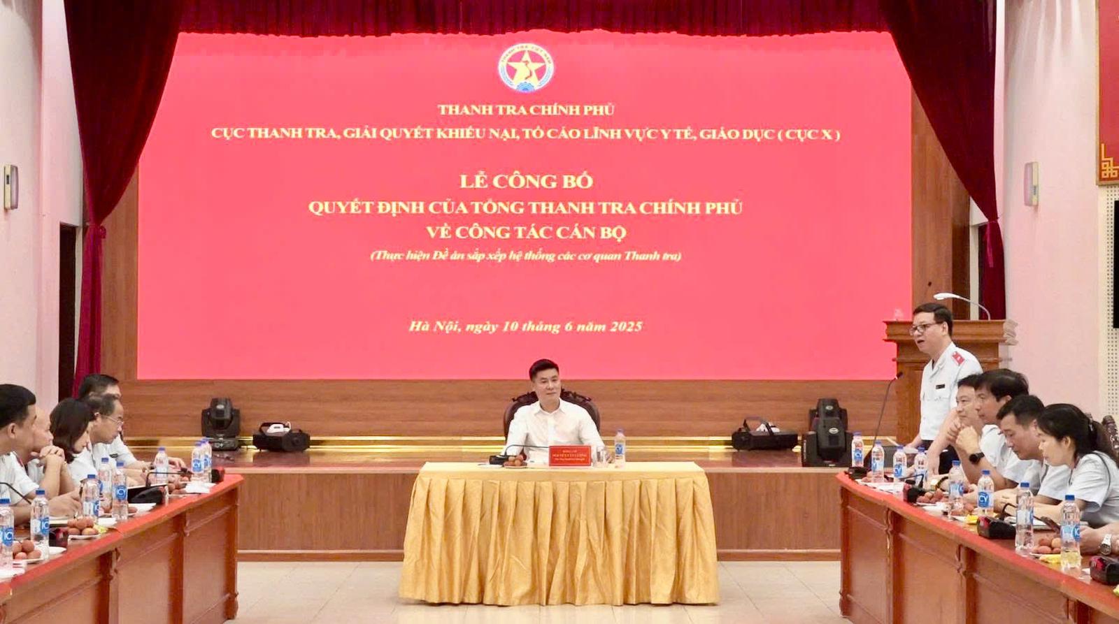 (Thanh tra) - Sáng ngày 10/6, Cục Thanh tra, giải quyết khiếu nại, tố cáo lĩnh vực y tế, giáo dục (Cục X), Thanh tra Chính phủ tổ chức lễ công bố quyết định của Tổng Thanh tra Chính phủ về công tác cán bộ, theo Đề án sắp xếp hệ thống các cơ quan thanh tra. Phó Tổng Thanh tra Nguyễn Văn Cường dự và phát biểu chỉ đạo.