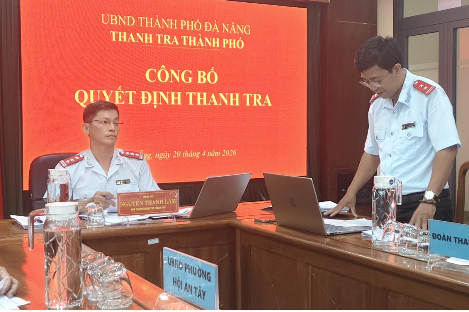 (Thanh tra) - Chiều 20/4, Thanh tra thành phố Đà Nẵng tổ chức công bố quyết định thanh tra trách nhiệm của Chủ tịch UBND phường Hội An Đông và phường Hội An Tây trong việc thực hiện pháp luật về tiếp công dân, xử lý đơn, giải quyết khiếu nại, tố cáo.