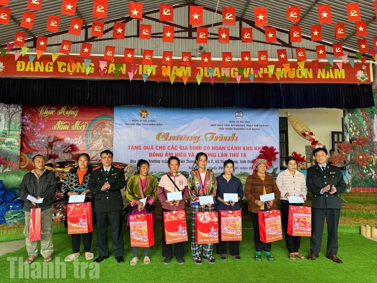 Bí Thư Đảng uỷ, Chánh Thanh tra tỉnh Vùi Văn Nguyện và Phó Chánh Thanh tra tỉnh Đỗ Văn Dưỡng tặng quà các gia đình có hoàn cảnh khó khăn tại xã Tủa Thàng nhân dịp chuẩn bị đón Xuân Bính Ngọ 2026. Ảnh: PV