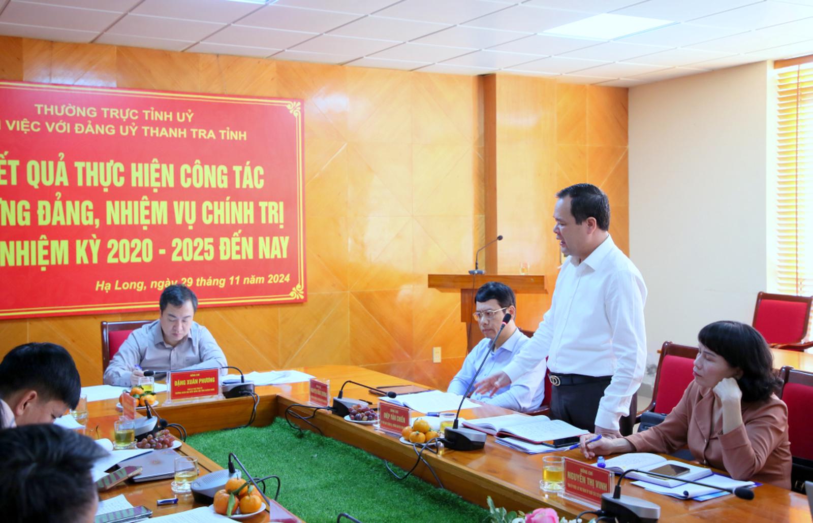 Phát biểu tại buổi làm việc, Phó Bí thư Tỉnh ủy Quảng Ninh Đặng Xuân Phương ghi nhận, biểu dương nỗ lực, cố gắng của Thanh tra tỉnh đạt được trong nhiệm kỳ qua trên các mặt công tác Đảng và công tác chuyên môn; đặc biệt là thành tích 4 năm liên tiếp Đảng bộ được công nhận tổ chức Đảng hoàn thành xuất sắc nhiệm vụ.