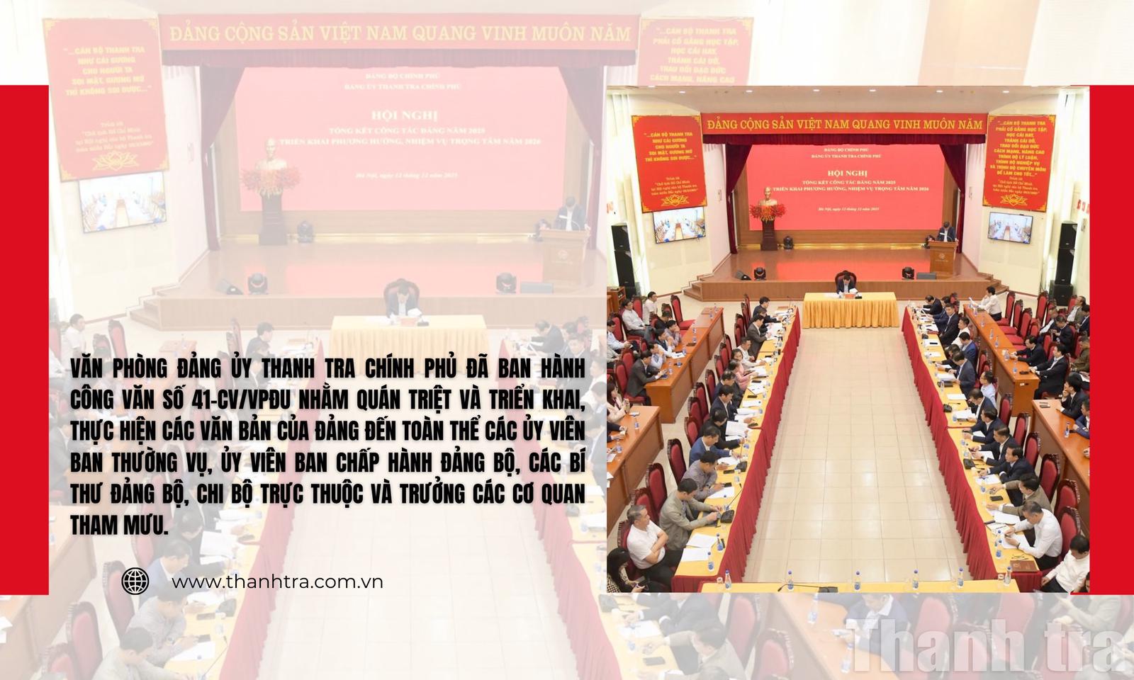 Văn phòng Đảng ủy Thanh tra Chính phủ đã ban hành Công văn số 41-CV/VPĐU để quán triệt và triển khai, thực hiện các văn bản của Đảng đến toàn thể các ủy viên Ban Thường vụ, ủy viên Ban Chấp hành Đảng bộ, các bí thư đảng bộ, chi bộ và trưởng các cơ quan tham mưu.