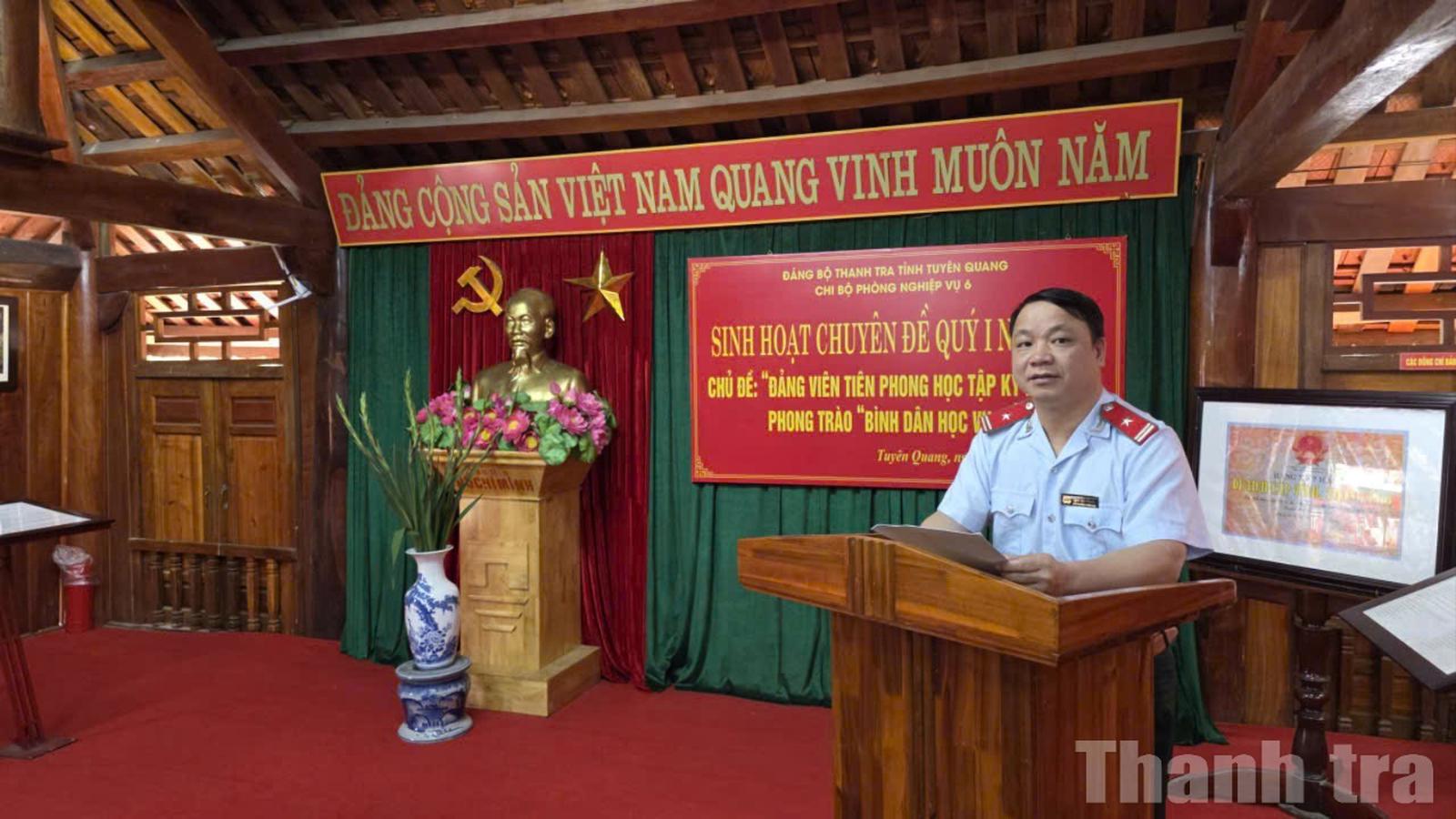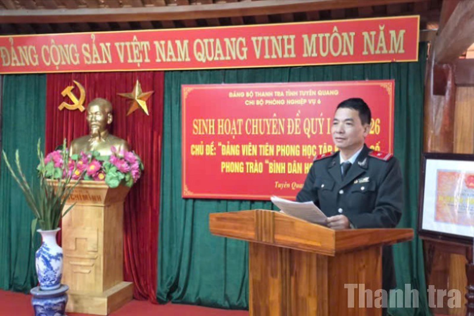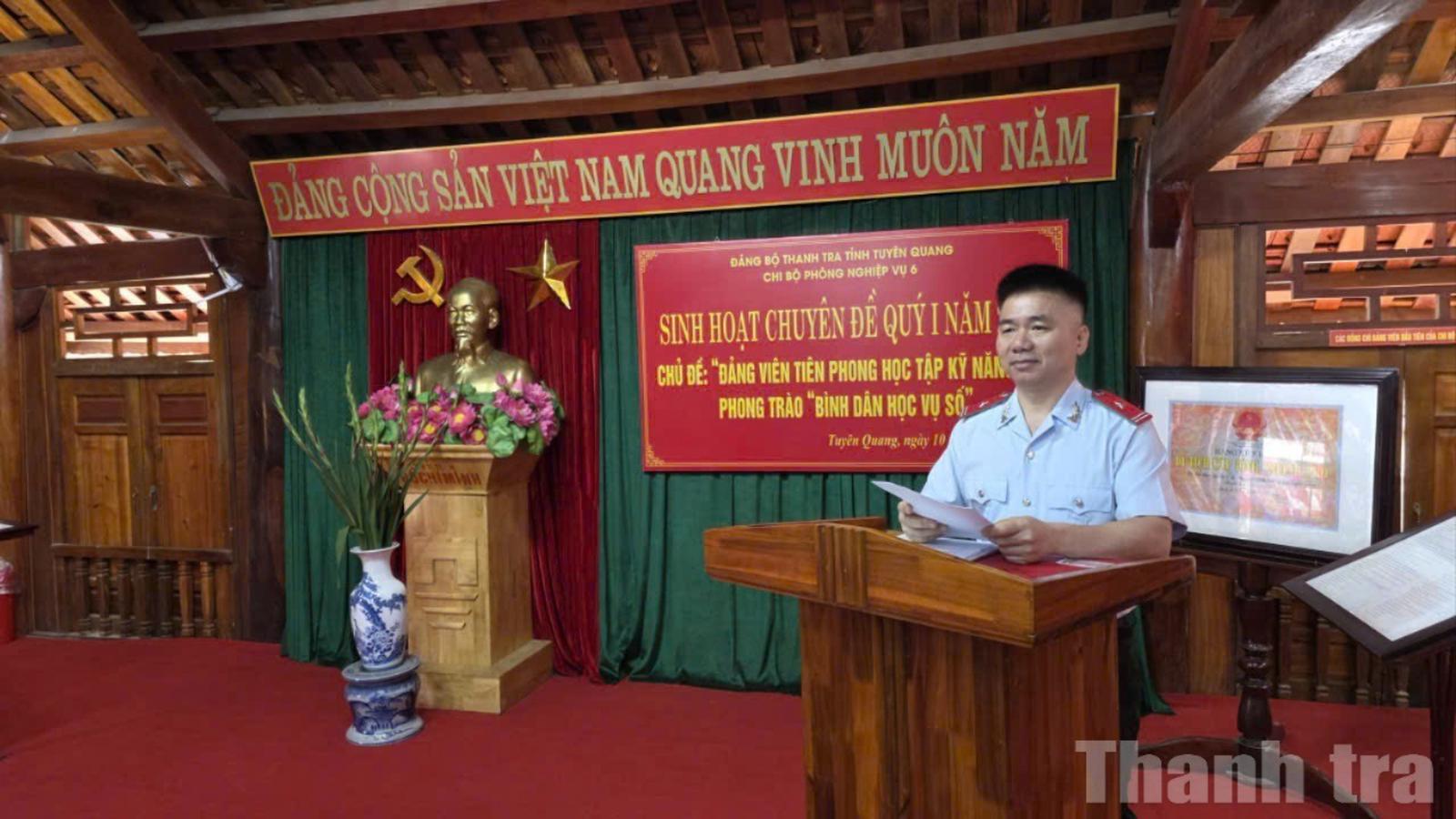 Ông Trần Văn Kiều, Phó Bí thư Chi bộ Phòng Nghiệp vụ 6, Đảng ủy Thanh tra tỉnh Tuyên Quang chủ trì buổi sinh hoạt chuyên đề về học tập, rèn luyện kỹ năng số. Ảnh: Bùi Bình