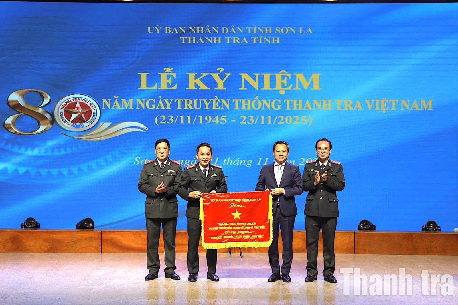 Chánh Thanh tra tỉnh Sơn La Nguyễn Văn Bắc (thứ 2 từ trái sang) cùng các Phó Chánh Thanh tra tỉnh đón nhận bức trướng do Chủ tịch UBND tỉnh Sơn La Nguyễn Đình Việt (thứ 2 từ phải sang) trao tặng. Ảnh: PV