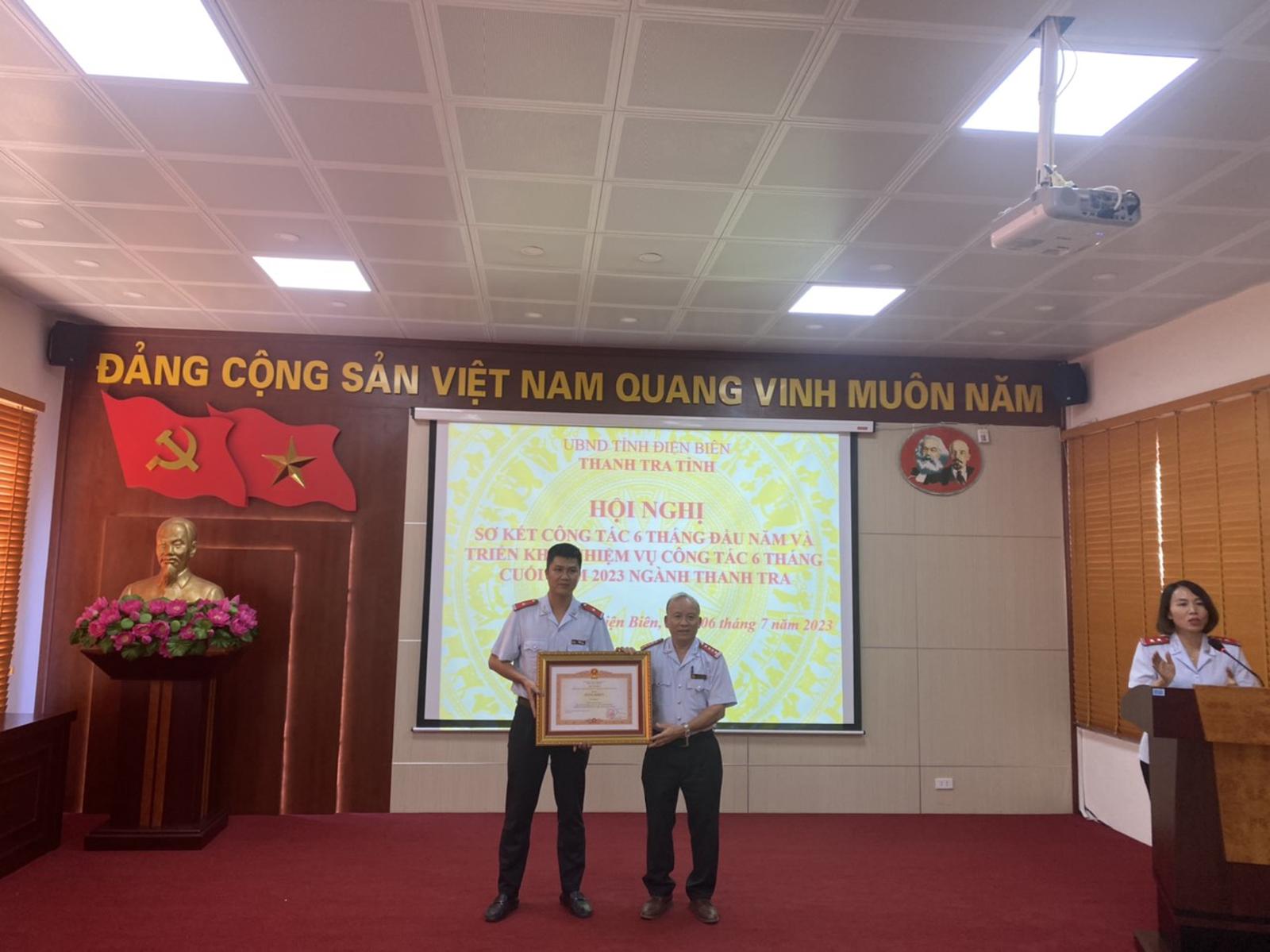 Chánh Thanh tra tỉnh Điện Biên Phan Văn Thống (bên phải) trao thưởng cho tập thể, cá nhân. Ảnh: Lê Huy