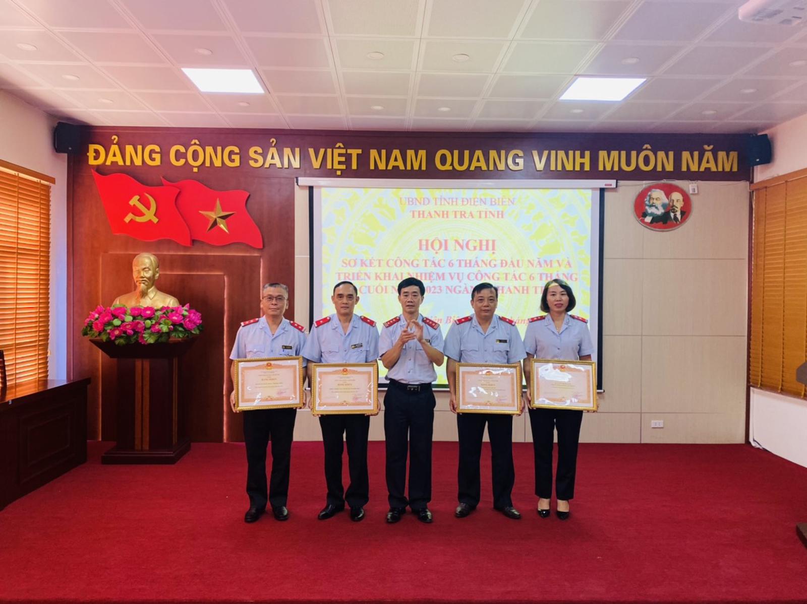 Phó Chánh Thanh tra tỉnh Điện Biên Trần Văn Chiến (đứng giữa) trao thưởng cho tập thể, cá nhân. Ảnh: Lê Huy