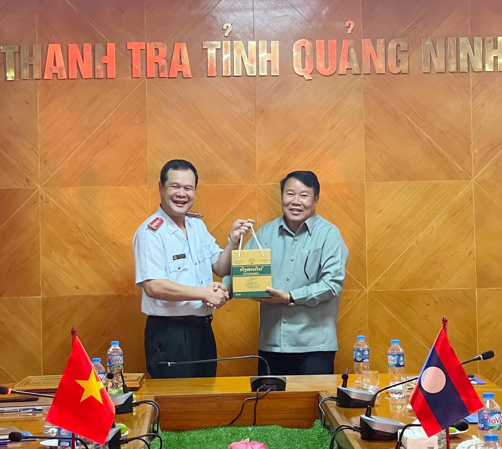 Ông Điệp Văn Chiến, Chánh Thanh tra tỉnh Quảng Ninh tặng quà chúc mừng đoàn cán bộ Thanh tra Lào. Ảnh: TH