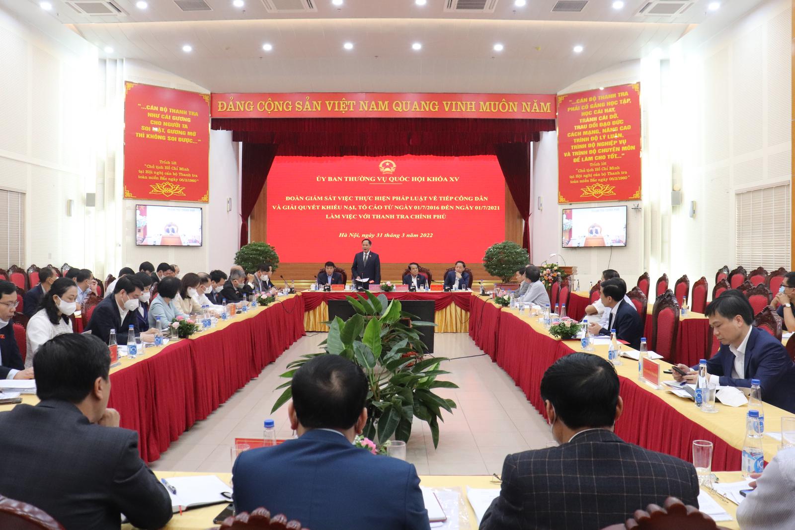 Báo cáo tại buổi làm việc, Phó Tổng Thanh tra Trần Ngọc Liêm cho biết, trong những năm qua, việc thể chế hóa đường lối, chủ trương của Đảng, Nhà nước về công tác tiếp dân, giải quyết KNTC luôn được Chính phủ quan tâm, thực hiện nghiêm túc. Hàng năm, Chính phủ đều có báo cáo trình Quốc hội giám sát, định kỳ hàng quý Chính phủ đều xem xét báo cáo của TTCP về kết quả tiếp công dân, giải quyết KNTC và có nghị quyết lãnh đạo, chỉ đạo thực hiện.