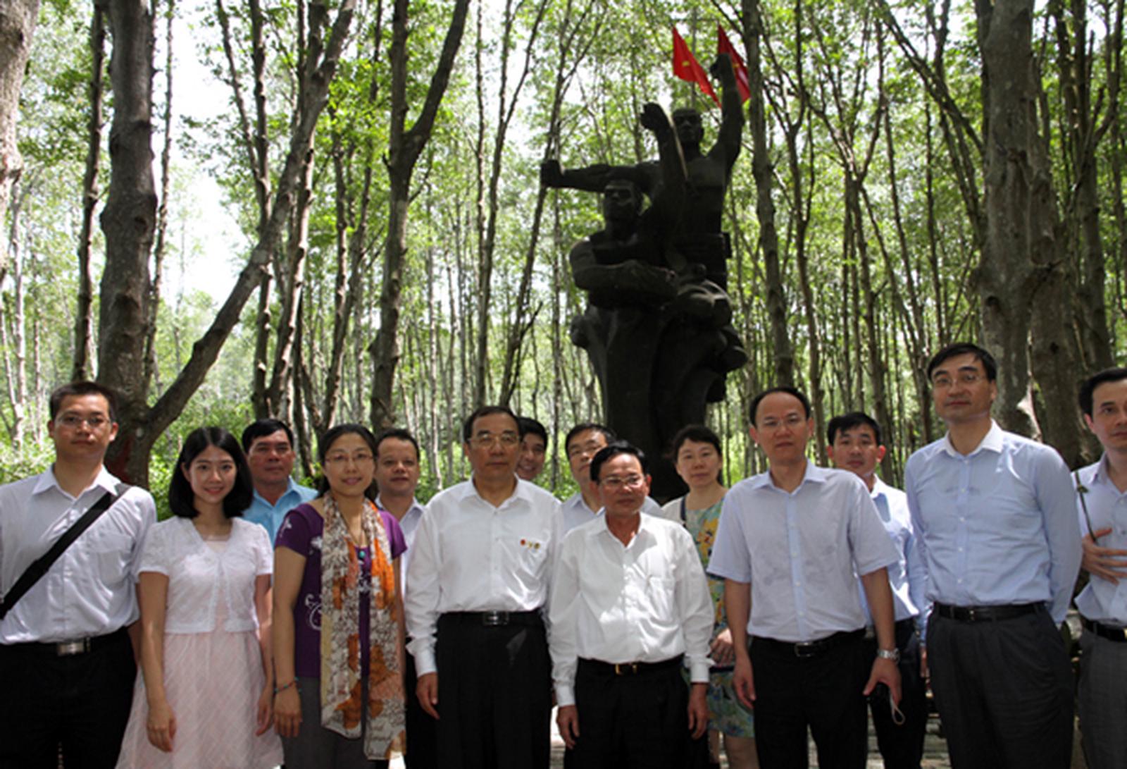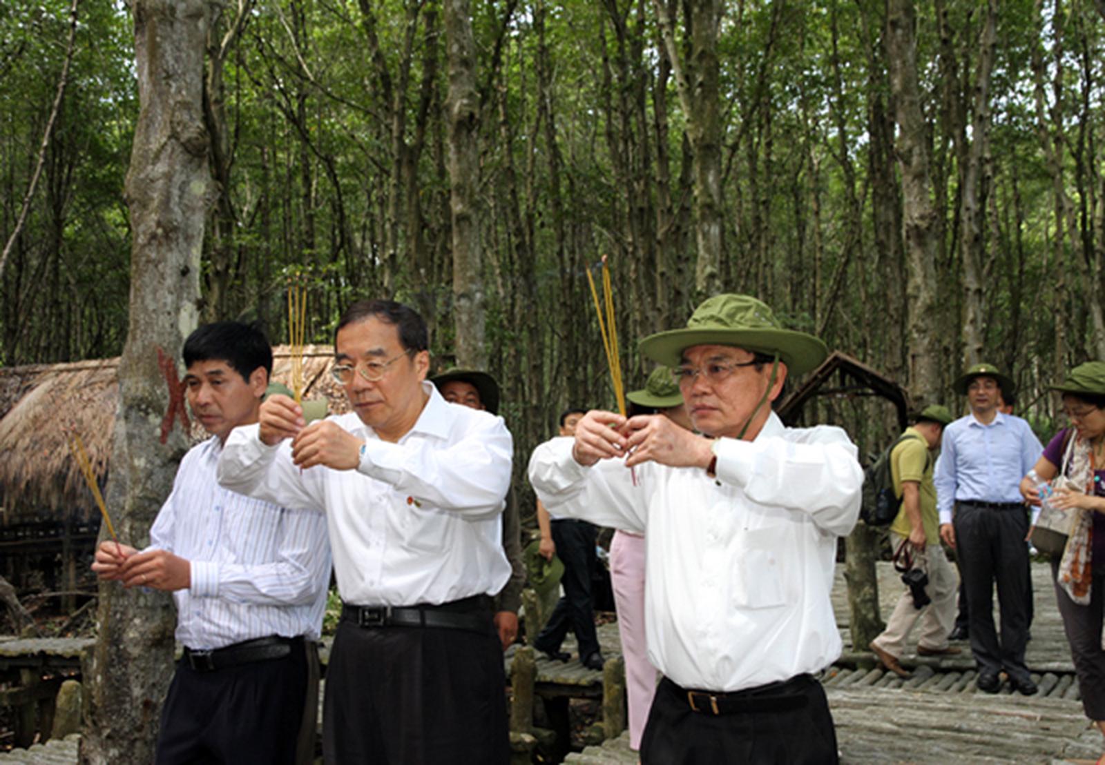 Đoàn đại biểu cấp cao Ủy ban Kiểm tra Kỷ luật Trung ương Đảng Cộng sản Trung Quốc tại tượng đài anh hùng đặc công rừng Sác. Ảnh NG