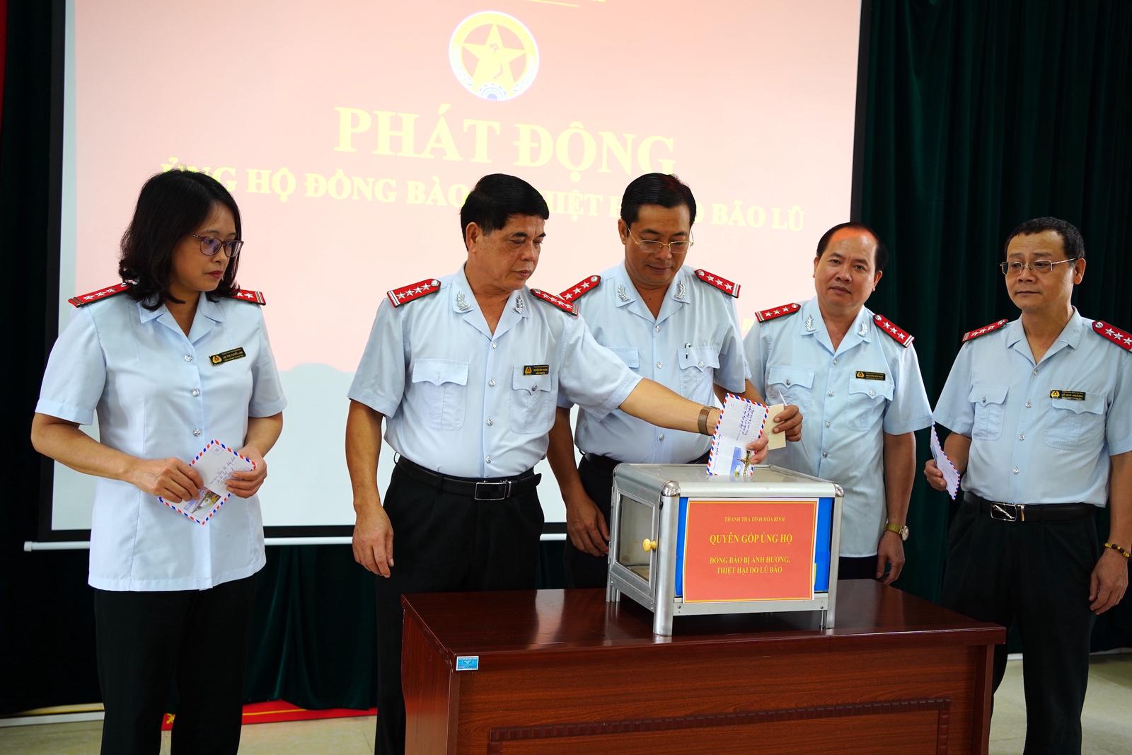 Cán bộ, công chức, người lao động Thanh tra tỉnh Hoà Bình quyên góp ủng hộ đồng bào bị thiệt hại do cơn bão số 3 gây ra. Ảnh: Đỗ Hùng