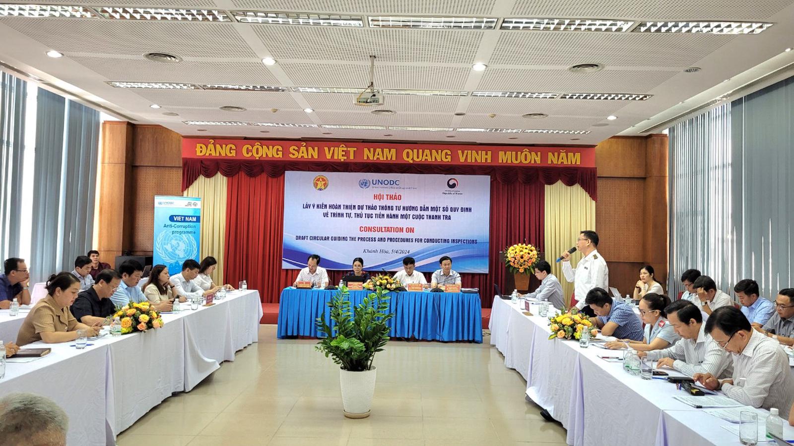 (Thanh tra) - Ngày 05/04, tại Nha Trang, Khánh Hòa, Thanh tra Chính phủ (TTCP) và Cơ quan Phòng chống Ma túy và Tội phạm của Liên hợp quốc (UNODC) đã phối hợp tổ chức hội thảo lấy ý kiến hoàn thiện Dự thảo Thông tư hướng dẫn một số quy định về trình tự, thủ tục tiến hành một cuộc thanh tra.